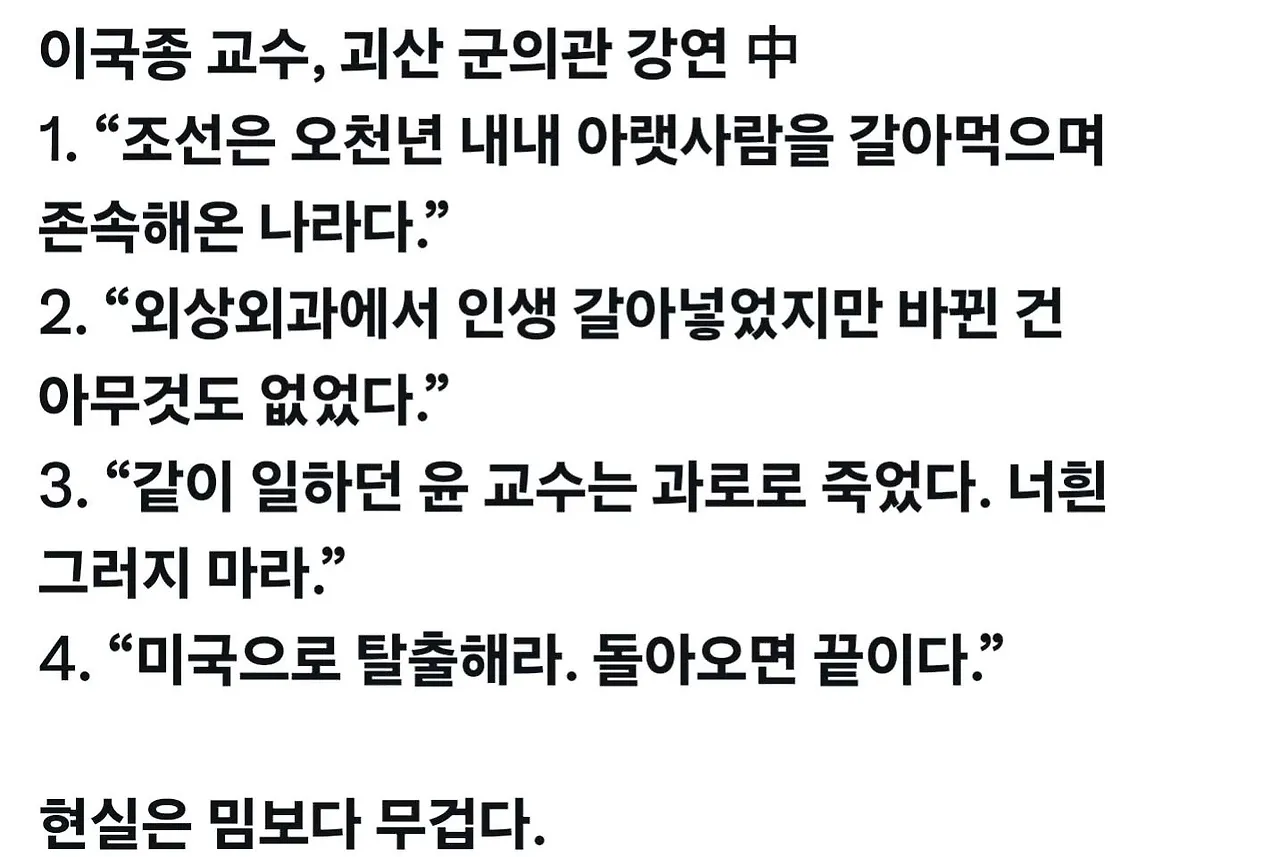 이국종 교수의 이야기인 "입만 터는 문과 X들이 해 먹는 나라"라는 비판은 혹독해 보이지만 우리 사회 기업 혹은 조직에 적용하면 모두 동일하다.