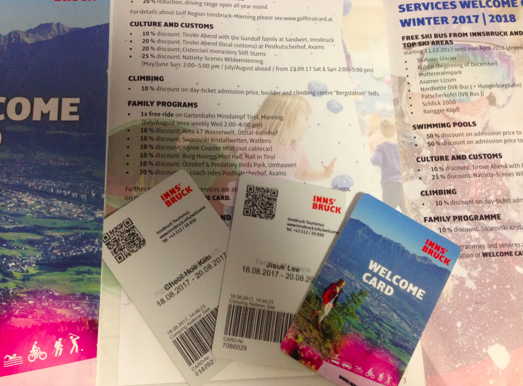 이곳 캠핑장은 54.4유로로 약간 비싼편이지만, 인스브루크 안내 책자와 버스 교통권과 함께 케이블카를 이용할 수 있는 카드를 제공한다