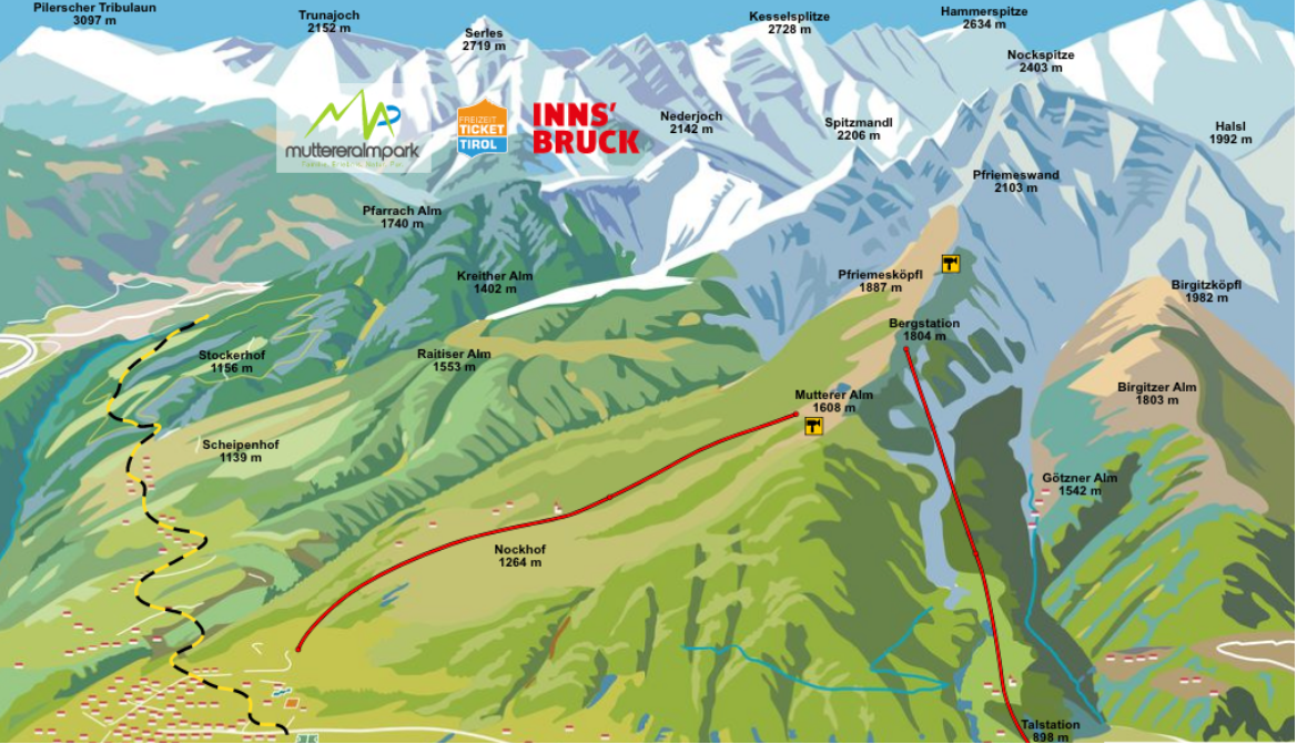 우리는 캠핑장에서 받은 환영 카드( Welcome Card)를 통해서 제공되는 무료 케이블카를 타기 위하여 뮈터알름공원(Mutterer Alm Park)으로 이동하였다.