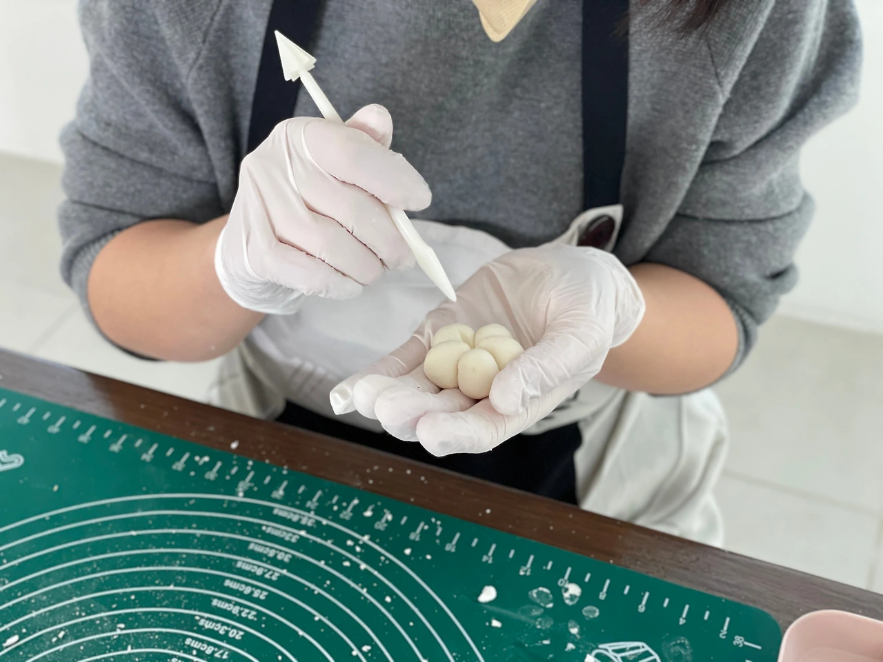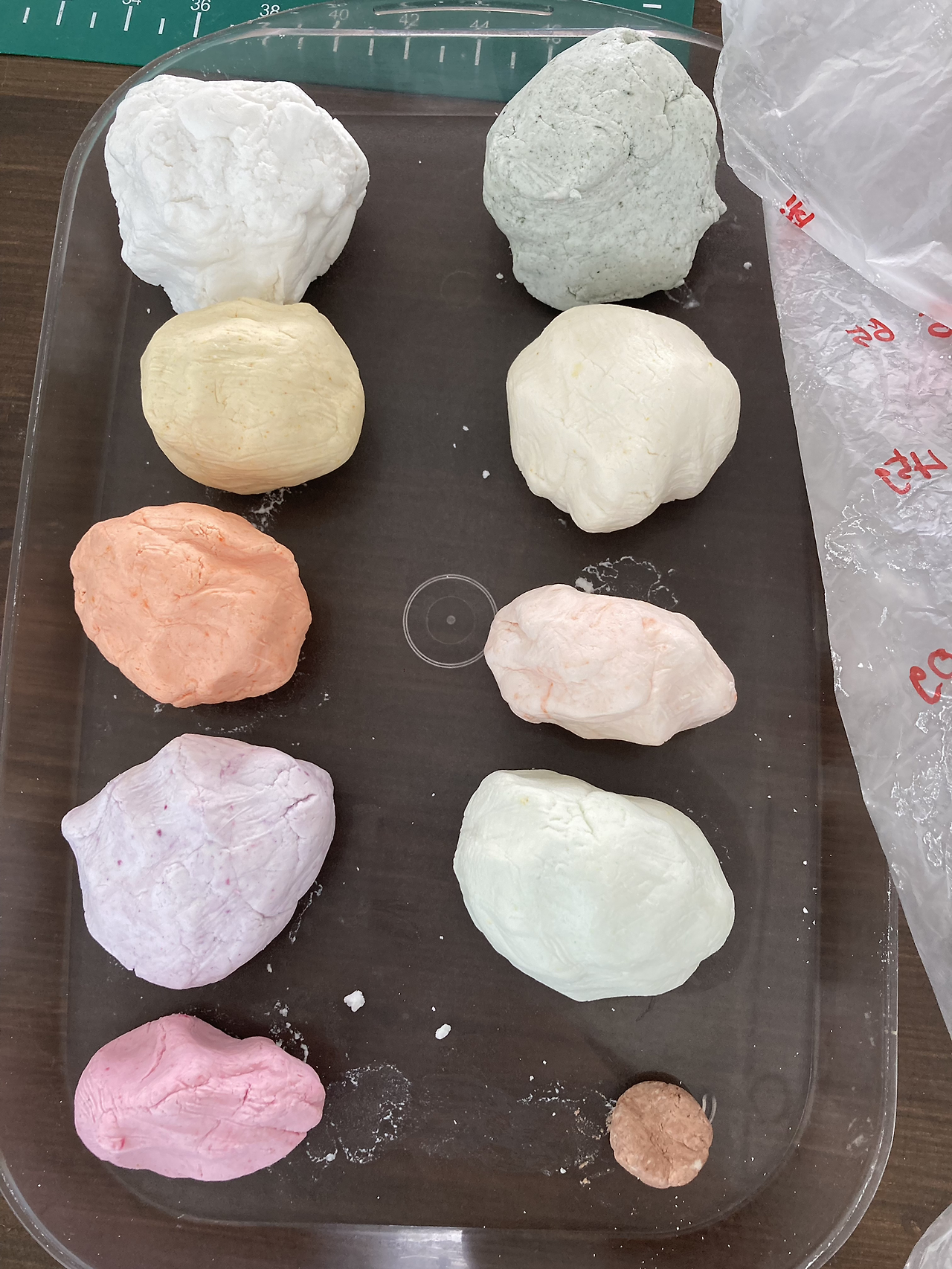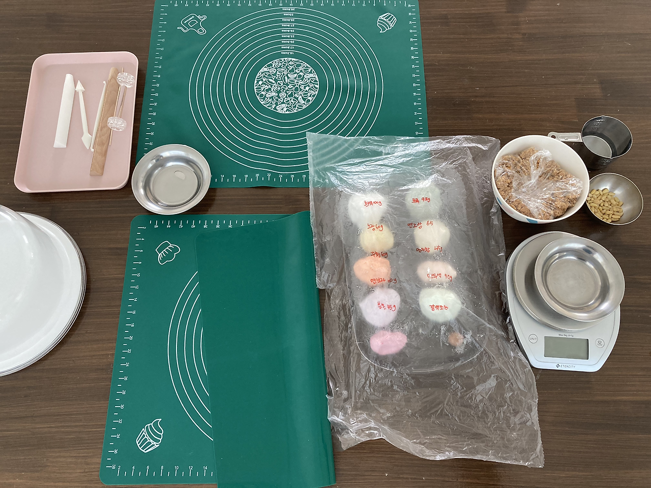 송편 재료와 만들기 과정을 설명해 주셨다. 재료는 '쌀가루, 여러 가지 천연 가루와 색소 가루, 그리고 깨소'가 있는데 '깨소'라는 단어부터가 생소해서 직접 만들기 전까지는 뭔지 몰랐다. 송편 만들기 과정은 설기 때보다 짧게 느껴져서 어렵지 않겠다 싶었지만 '익반죽', '소분', '성형'... 낯선 단어들로 머릿속에선 순서들이 뒤죽박죽이었다. 거기에 오늘 만들 떡 개수가 열 가지.....??? 어리둥절하며 만들기 시작.