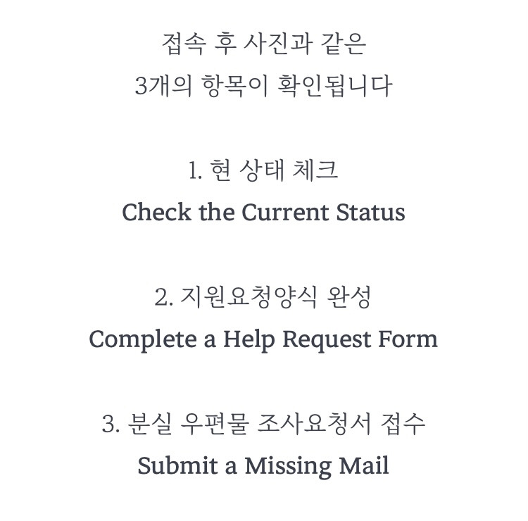 아가씨께서 USPS 사이트 내 분실물 접수를 위해 (1) 현 상태 체크 후 (2) 지원요청양식 완성을 해주셨다. 하지만 돌아온 답변은 "정확한 주소로 배송되었기에 더 확인할 방법이 없습니다.” 그래서 이번엔 배송 기사님께 한번 더 확인해 달라고 요청했다 하셨다. 하지만 역시나 "담당 배송기사가 당일 off였기에 어떤 기사가 다녀갔는지 알기 어려울뿐더러(이건 무슨 말인가요;;) 시스템상 정확한 주소지로 배송되었으니 저희쪽에서는 더 도와드릴 방법이 없습니다. “