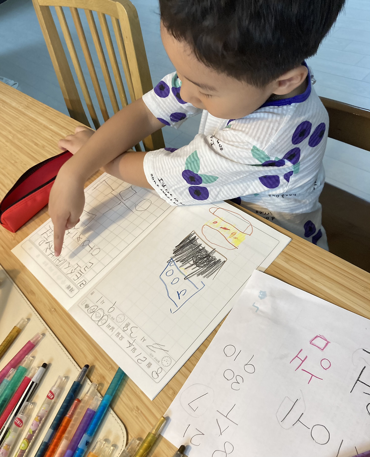 그래서 고민 끝에 ‘티끌 모아 태산’을 하기로 했다. 바로바로 일기 쓰기! 당장은 엄마 글씨 따라 쓰는 정도만 가능하지만 일기장 한 권이 두 권이 되고 열 권이 되면 언젠간 속마음도 한글로 편하게 적는 날이 오지 않을까. 더불어 일기 쓰기는 아이의 공부습관에도 좋다고 하니 일석이조~