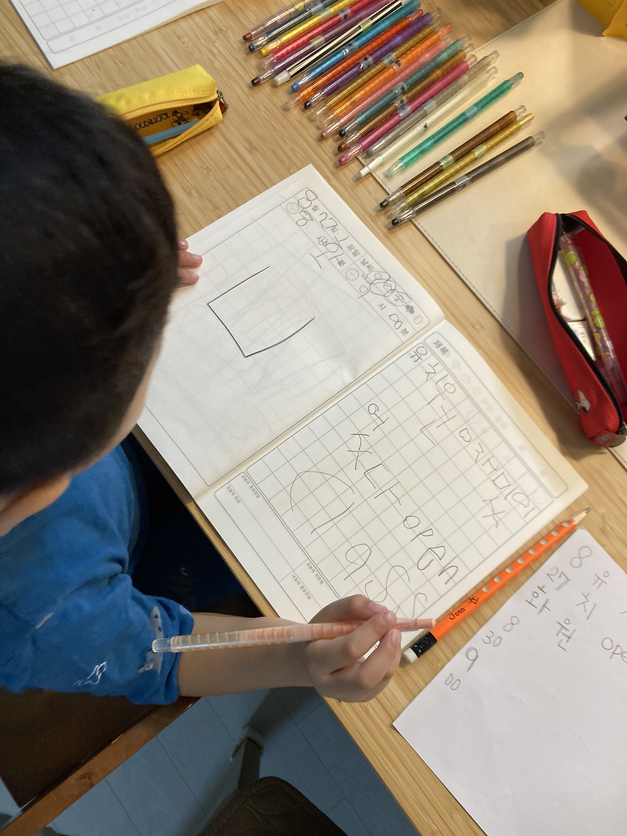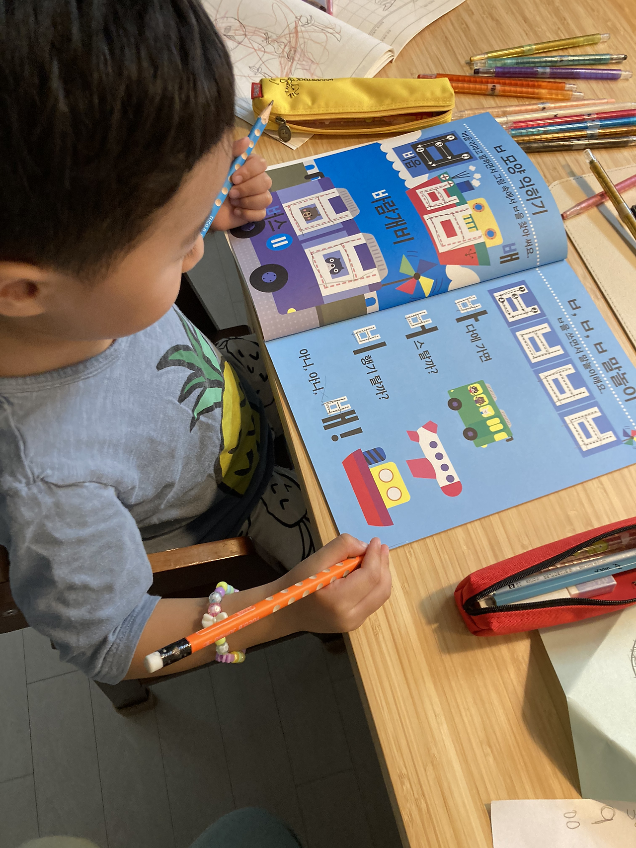 어제는 일기를 다 쓰고 나니 밤 9시 반이 넘어가고 있었다. 엄마는 빨리 재우고 싶어서 정리하려는데 첫째는 한글 공부책을 폈다. 두 페이지하고 닫고 수학 공부책 펴서 한 페이지. 이럴 땐 바라보기만 하기로 마음먹었기에 끝까지 기다려줬다. 공부 습관이란 게 이런 거라면 조금씩 잘 잡히고 있는 것 같다.