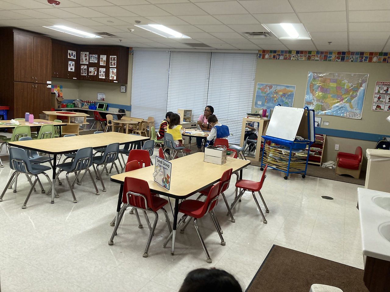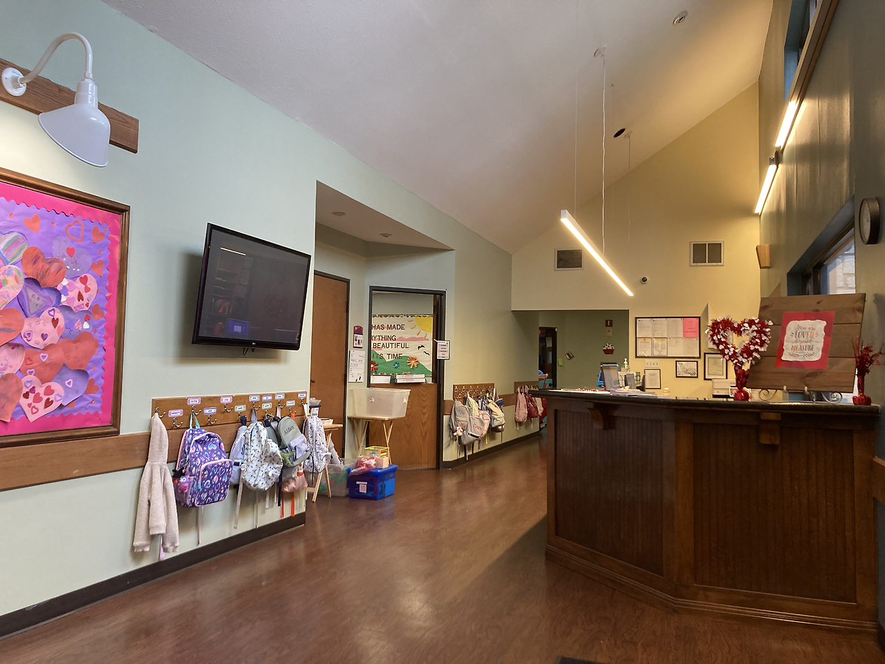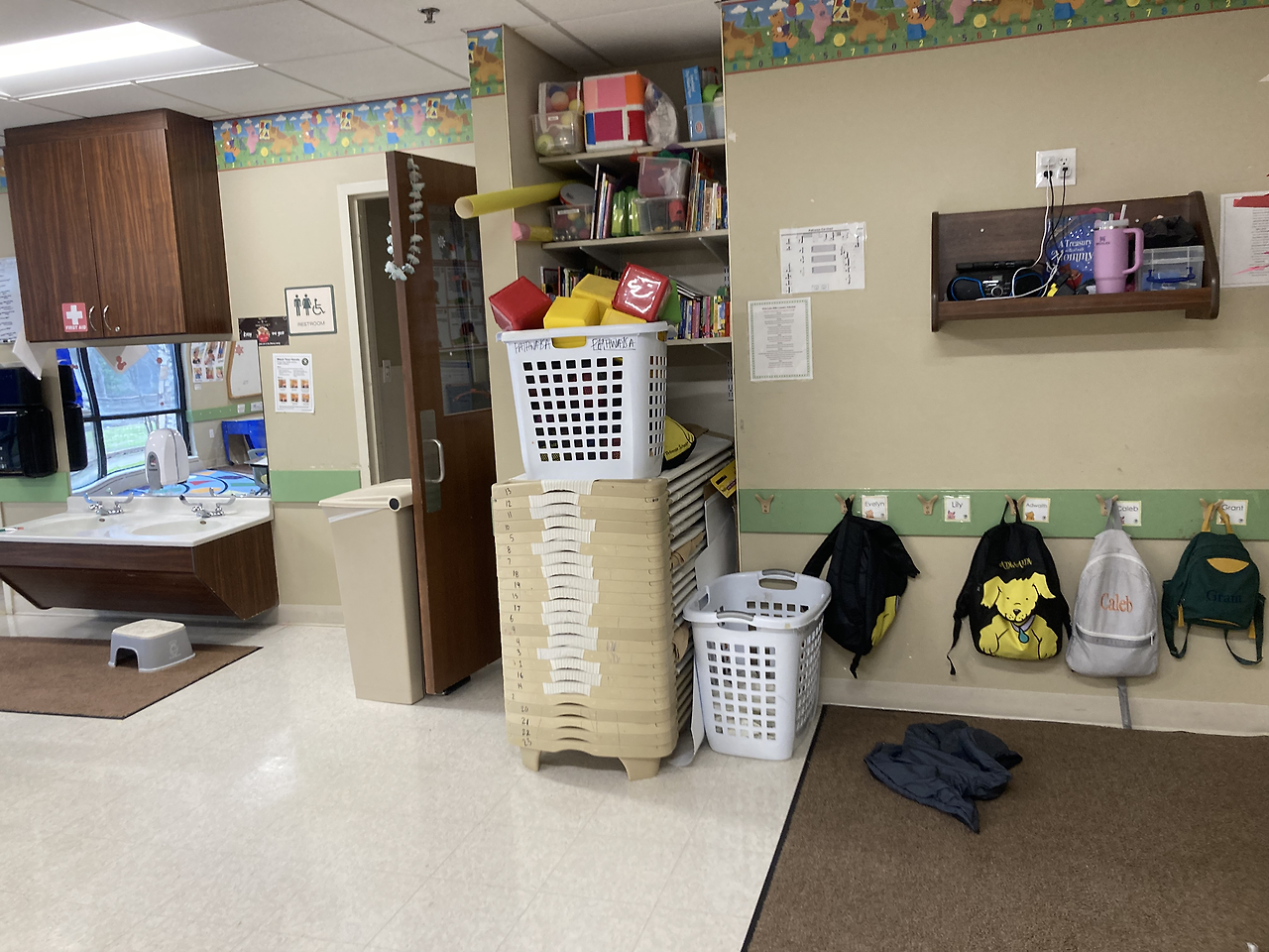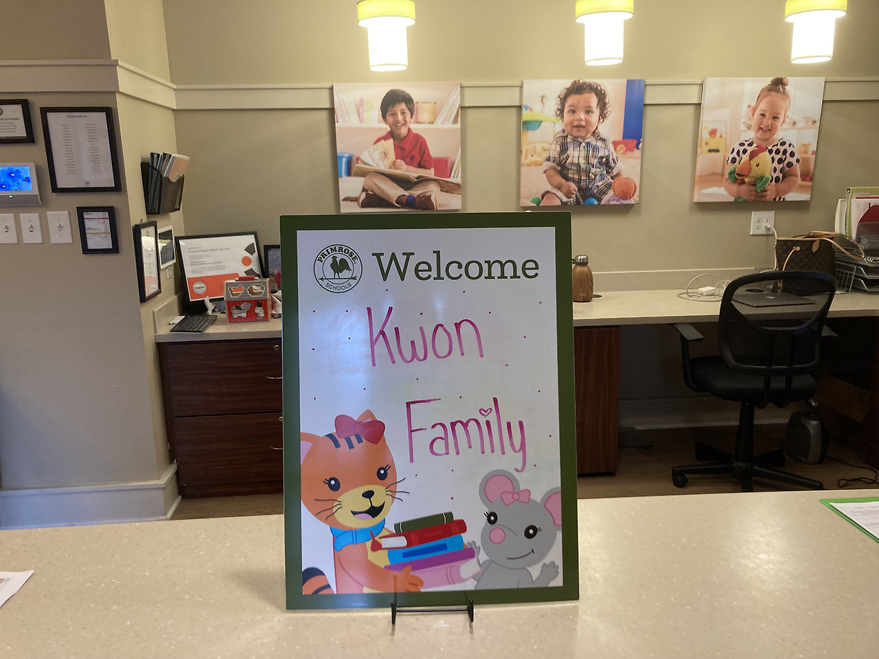 우리 셋을 가장 기분 좋게 반겨준 학교였다. 장점 (예약 시간에 맞춰갔더니) 카운터에 권 패밀리!라고 적어주고 스크린에도 환영한다는 문구가 보였다. 장점 직원들도 모두 밝게 보였고 내부도 매우 깔끔했다. 마침 놀이터 쪽에서 아이들 노는 소리가 들려 잠깐 구경했다. 큰 형님반을 위한 큰 놀이기구는 있었지만 단점 아장 아기들은 작은 공간에서 쪽쪽이만 물고 있어 조금 답답해 보였다. 만 4세 반 교실 내부는 굉장히 넓었고 (뜀뛰기 판을 쌓아 올려놓은 듯한) 간이 낮잠 침대들도 있었다. 첫째는 낮잠을 안 자서 이곳을 선택하지 않았지만 저녁 6시쯤 하원하는 친구들에겐 필요한 시간일 것 같다. 장점 투어 후 울 아가들에게 선물까지 주시는 센스! 덕분에 장난감 하나 없던 집에 소소한 놀잇감들이 생겨 감사했다. 하지만 단점 낮잠뿐만 아니라 월 학비가 너무나 비싸서 고민할 여지도 없이 리스트에서 제외됐다. (명당 월 2000달러... 두 명이면 4000달러... 월급에서 렌트비 빼고 학비 빼면 남는 게.... 무리다 무리)