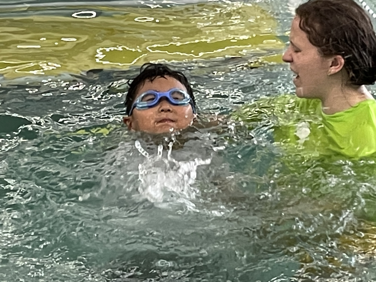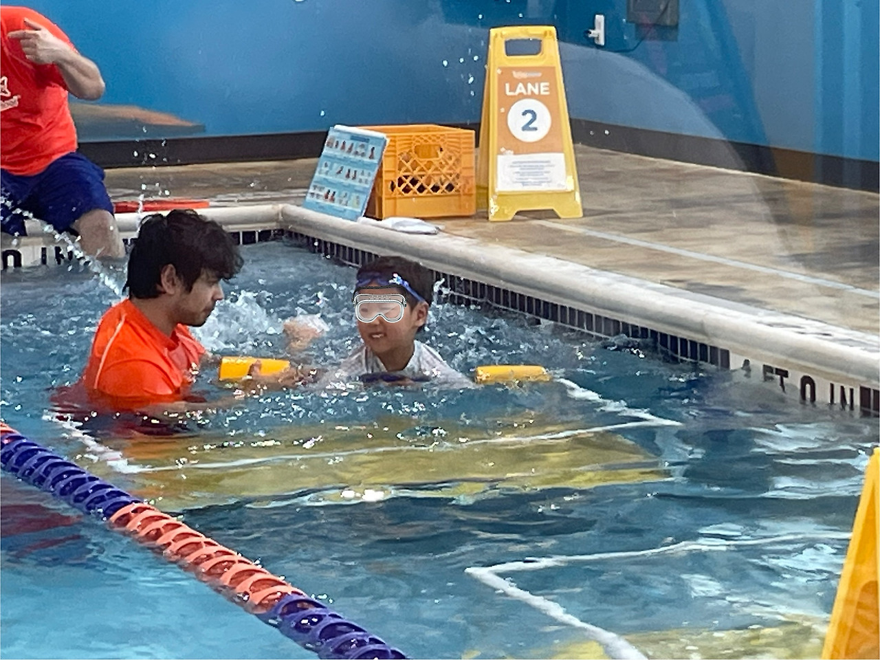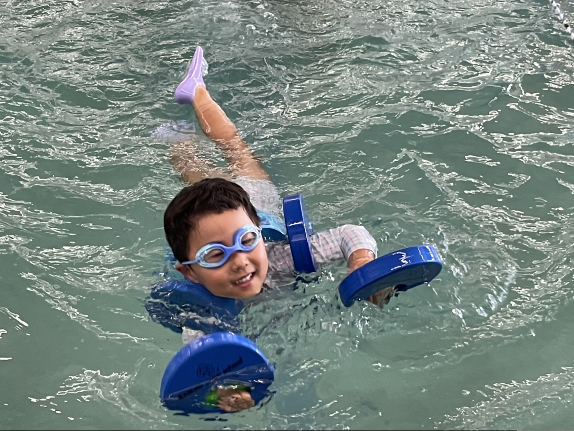왼쪽 사진처럼 처음 시작은 아주 즐거워 보였다. 각종 아이템들을 장착하고 열심히 왔다 갔다 했다. 수영 스킬 세 가지를 반복해서 두 세트 하시는 것 같은데 세 번째 스킬이 처음엔 거슬렸다. 물속에서 숨 쉬는 걸 배우지 못한 아이한테 일정 거리를 수영하게 시키는 것. 다행히 아이가 물속으로 꼬르륵 들어가기 전에 선생님이 잡아주셔서 아슬아슬하게 넘어갔다. 하지만 두 번째는 아니었다. 선생님은 바로 뒤에 계셨지만 물속으로 들어가서 못 나오고 있는 첫째를 지켜보고만 계셨다. 그렇게 두 번을 시키셨고, 나는 아파트 수영장 사건과 같은 장면을 또 바로 앞에서 목격하게 되었다.