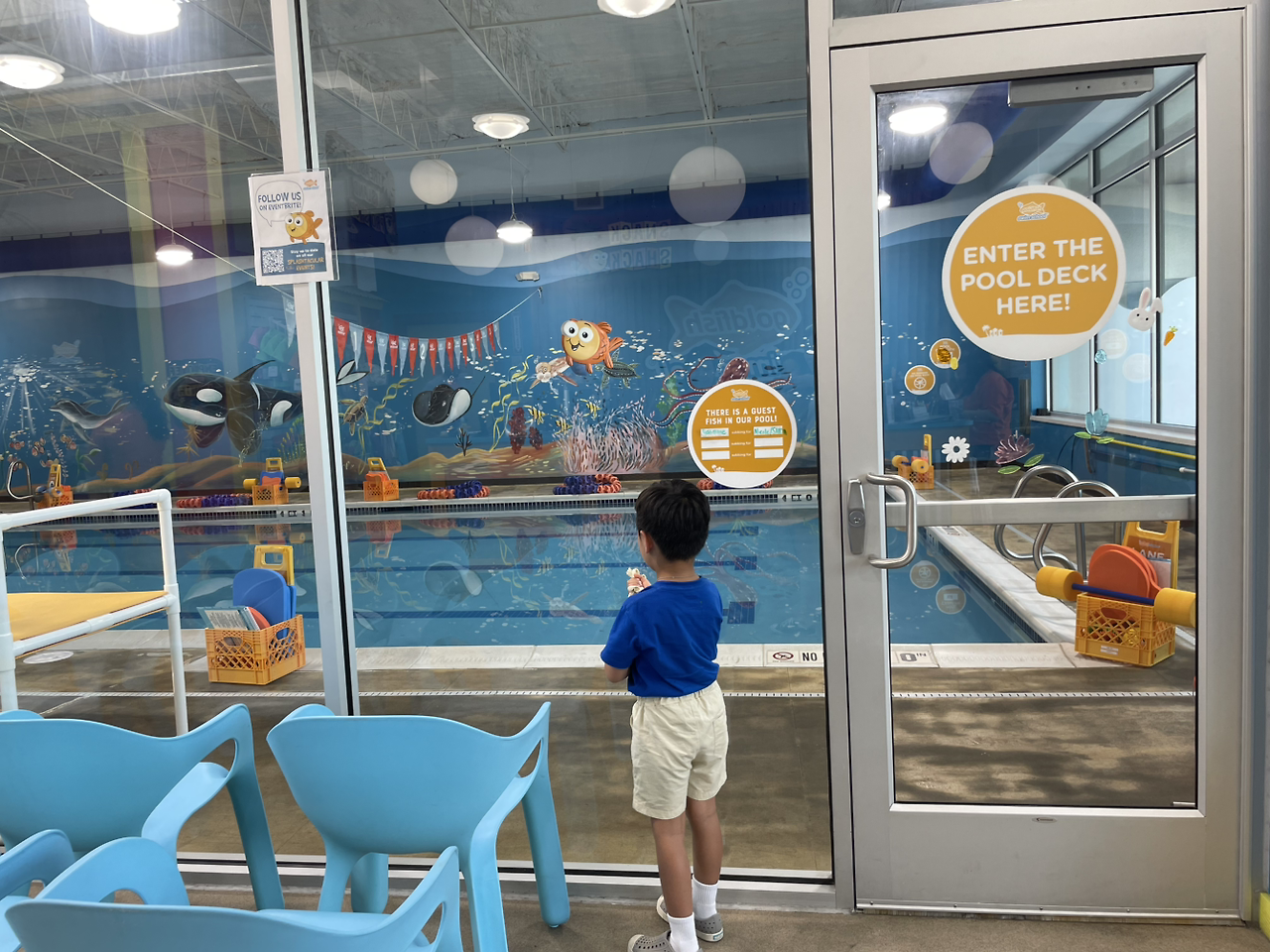 집 주변으로 평점 좋은 수영 학원을 두 군데 골라서 체험 수업을 신청했다. 처음으로 간 곳은 G 수영학원. 들어가자마자 아이도 엄마도 한눈에 반할 만큼 흥미로워 보이고 알록달록하고 쾌적했다(장점). 데스크 직원은 우리를 반갑게 맞이해 줬고 첫째의 정보가 적힌 팔찌를 채워주셨다(장점). 우리가 일찍 도착했던 탓에 10-15분 시간이 남았었지만 키즈 플레이존이 따로 마련되어 있어 따분하지 않았다(장점).