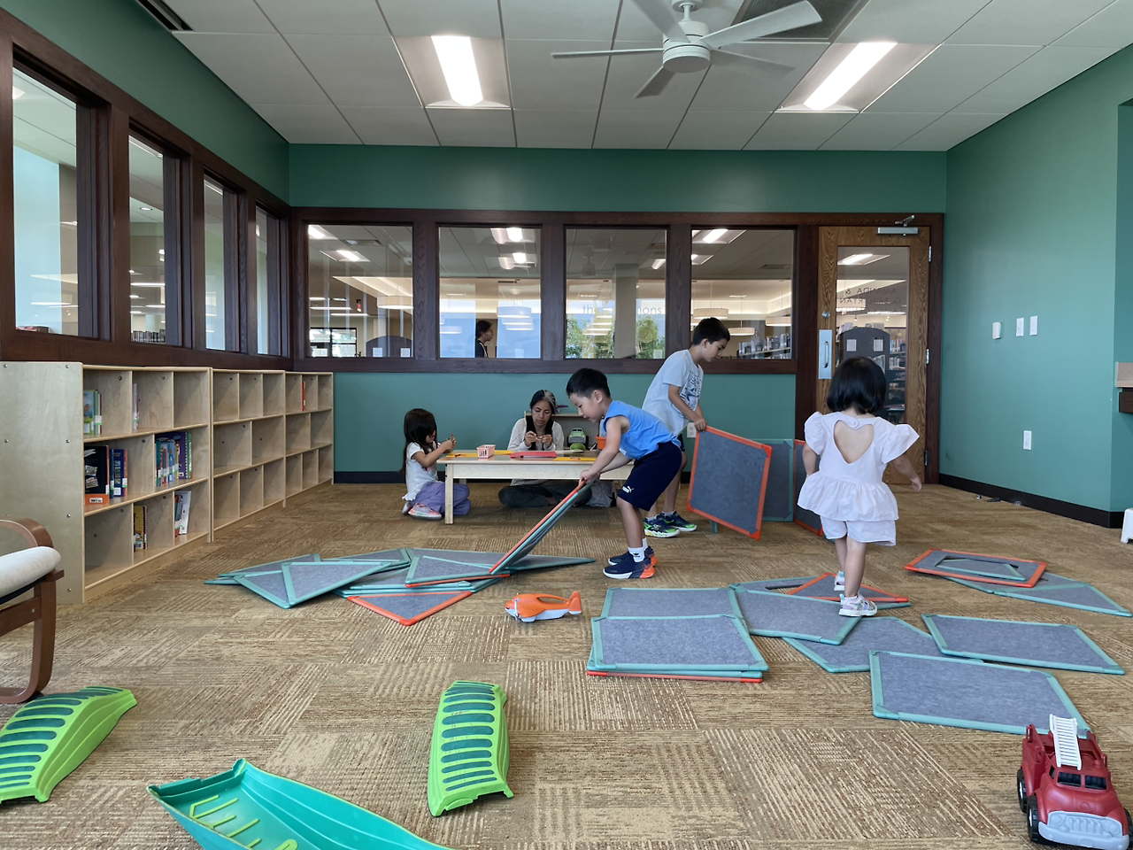 도서관에 왔으니 책을 펼쳐보기라도 해보자 싶어서 아가 책들이 보이는 패밀리 룸으로 들어왔다. 앗! 실수. 이 방에도 아주 재미나게 보이는 장난감들이 있었다. 이번에는 3D로 집을 지을 수 있는 자석들. 이번 방문은 투어에 목적을 두자 싶어서 ‘도서관 속 책육아’는 포기했다. 도서관이 즐거운 곳이라는 걸 느끼고 가기만 해도 반은 성공이지!