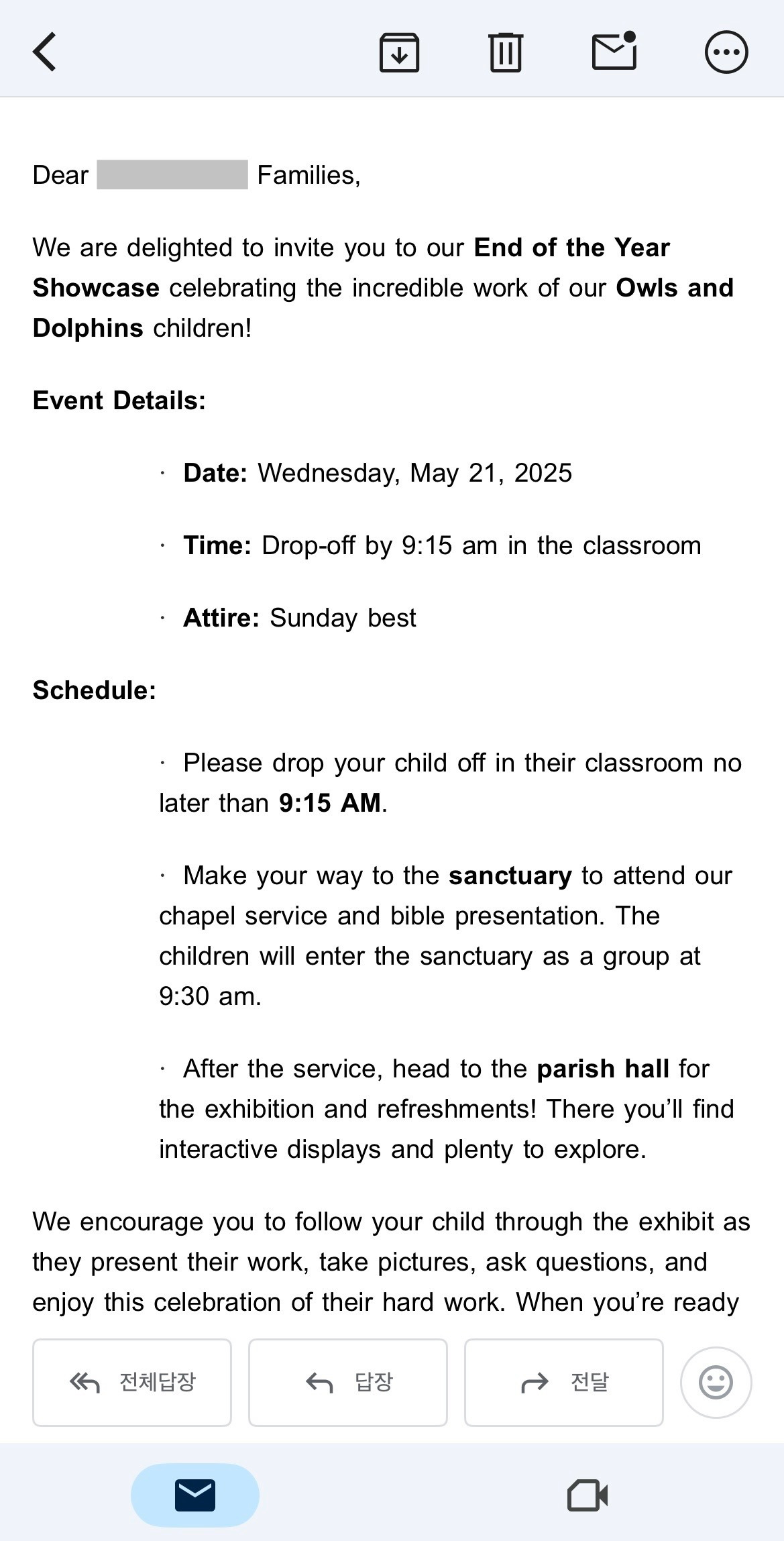 학교에서 보내온 포스터엔 ‘2025 END OF YEAR SHOWCASE’라고 적혀 있었고, 전날 받은 리마인드 이메일엔 ‘Attire: Sunday best(주일 예배에 입는 단정한 옷차림)’이라는 문구가 있었다. 그래서 적혀 있는 대로 옷차림만 신경 써서 등원시켰다.
