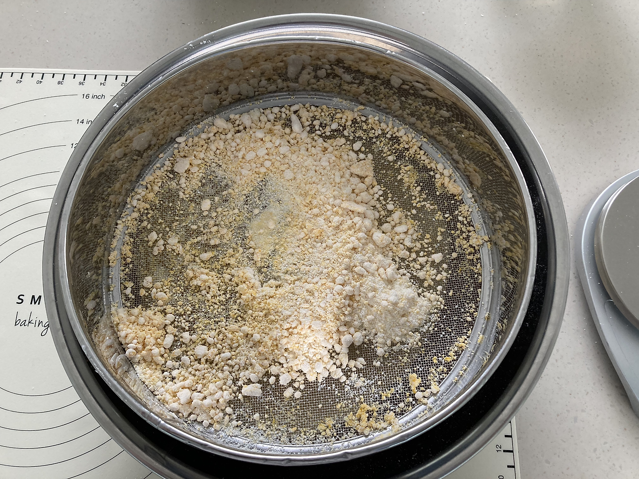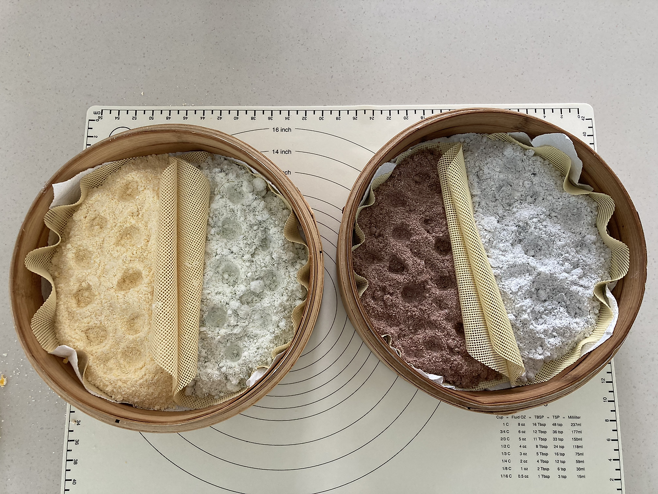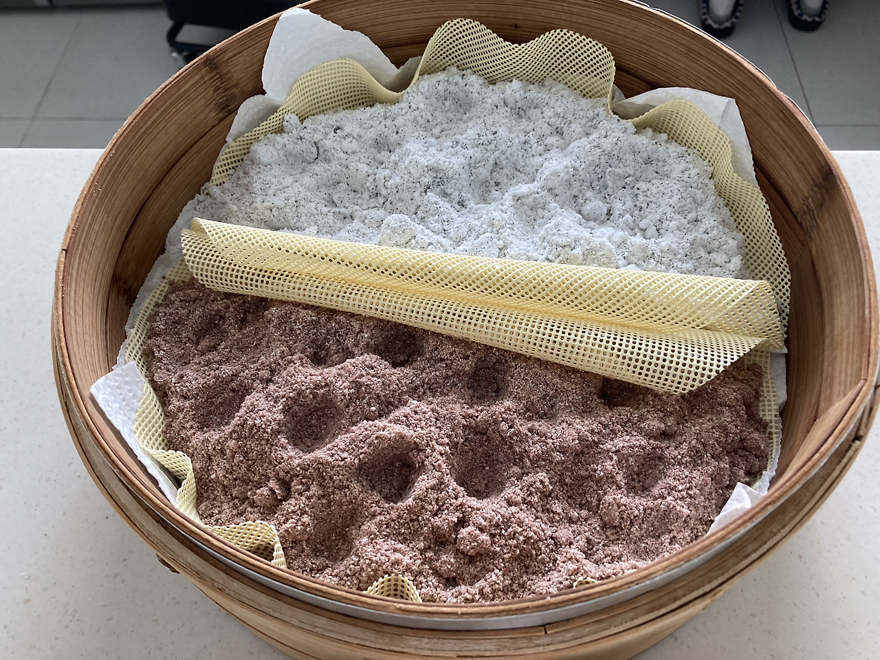 떡이 다 쪄지면 시루밑 채로 하나씩 꺼낸다. 스크래퍼를 이용해 붙어있는 떡을 떼어낸다. 시루밑에 붙은 떡은 떼어낸 떡으로 떼면 잘 떨어져 나온다. 그리고 떡 덩어리에 설탕 넣는다. 떡이 뜨거운 상태라 설탕을 안쪽으로 넣고 (떡으로) 덮어주면 녹는다. 3-5분 정도 기다리고 적당히 녹았다고 느껴지면 그때부터 떡을 치댄다. 녹은 설탕 때문에 떡 덩어리가 살짝 분리(?)되는 것처럼 보일 수 있지만 당황하지 않고 계속 치대면 다시 쫄깃해진다.