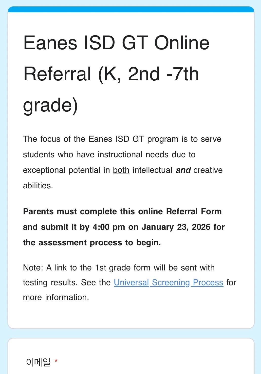 이사가 끝나자마자, 기다렸다는 듯 첫째 학교에서 이메일이 하나 도착했다. 킨더 중 GT 시험에 응시하고 싶은 아이들은 신청서를 제출하라는 안내였다.