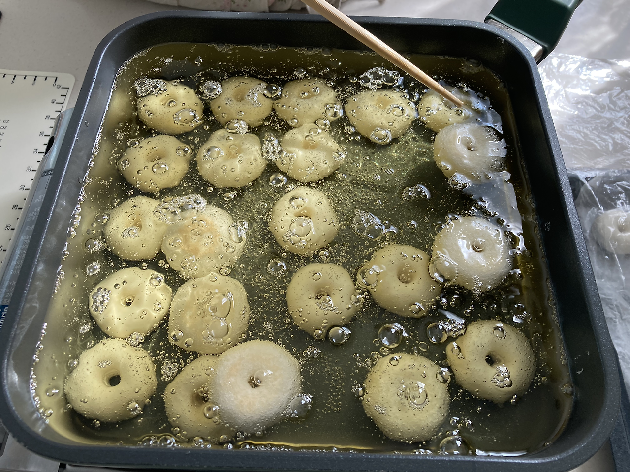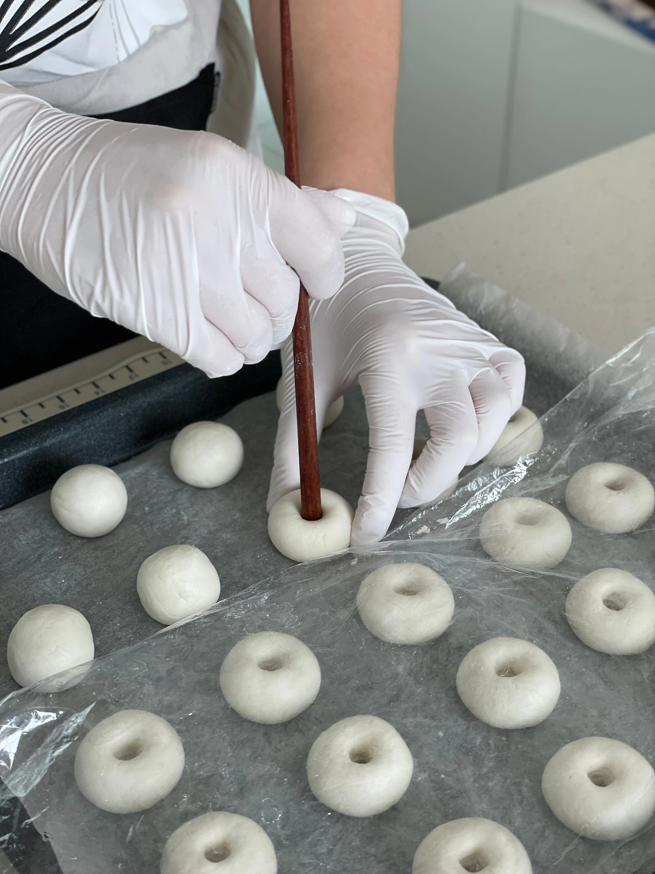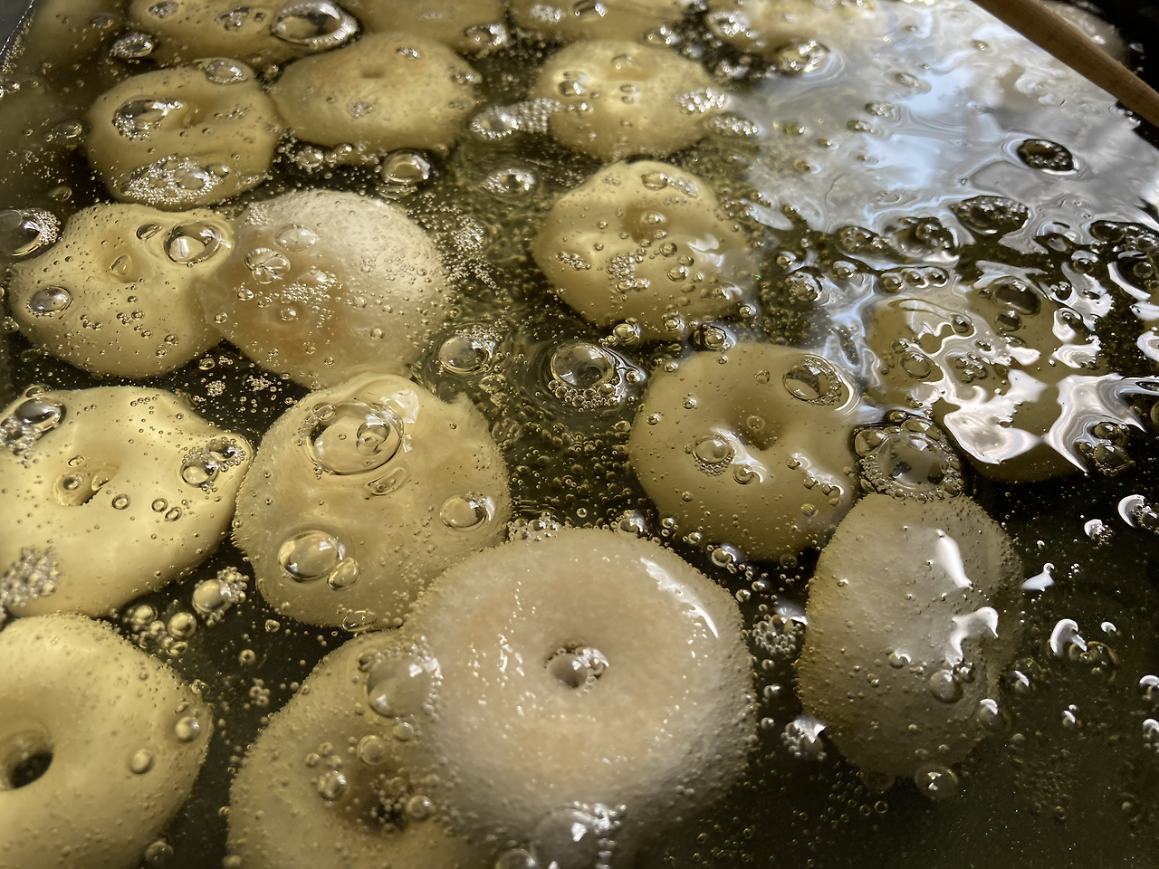 찹쌀가루로 반죽을 만들어서 동그랗게 빚는다. 막걸리가 들어갔기 때문에 소분해서 반죽할 때는 여러 번 눌러서 안에 있는 공기를 빼야 한다. 그래야 튀길 때 터지지 않는다고 한다.