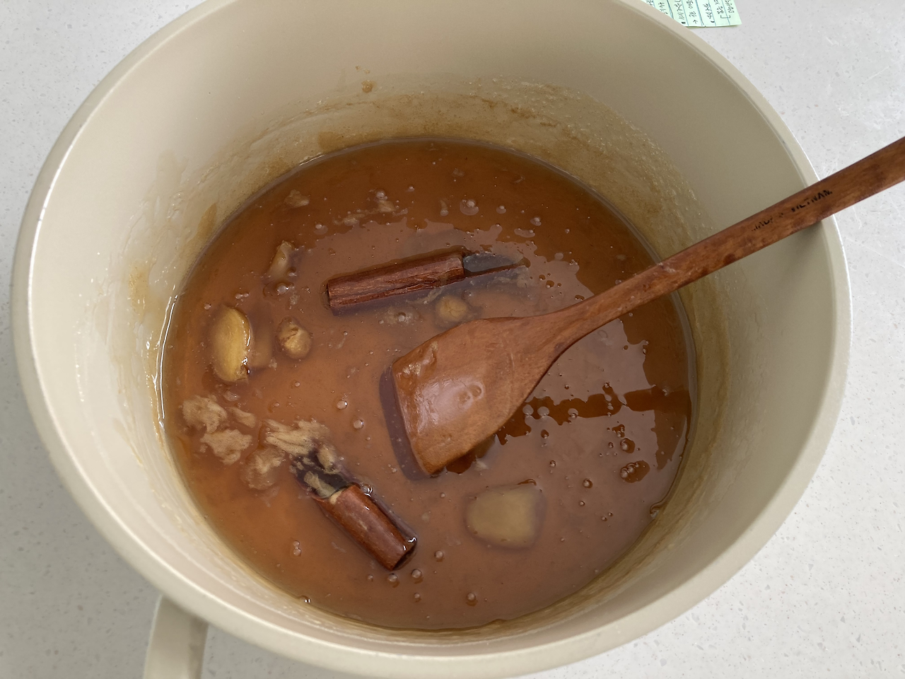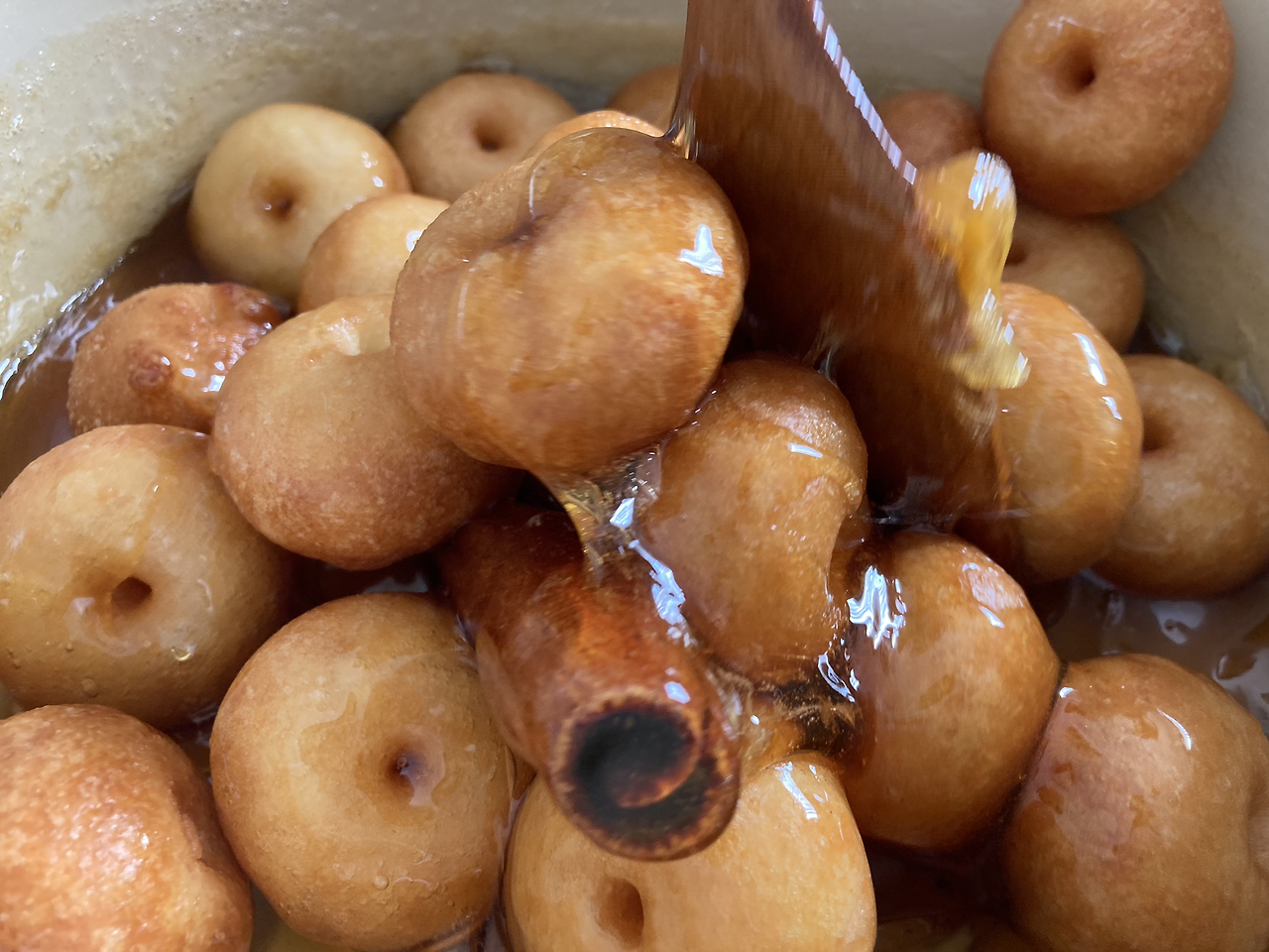 시럽처럼 만들어진 집청에 튀겨진 반죽을 다 넣고 열심히 저어준다. 20분 정도 담가둔다.