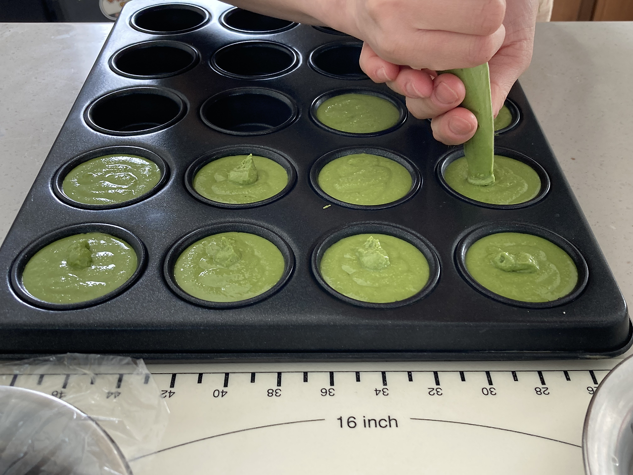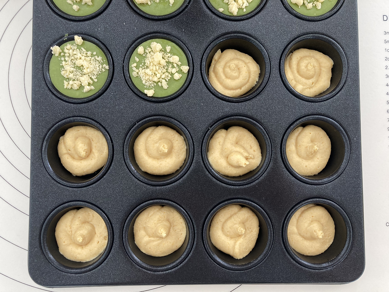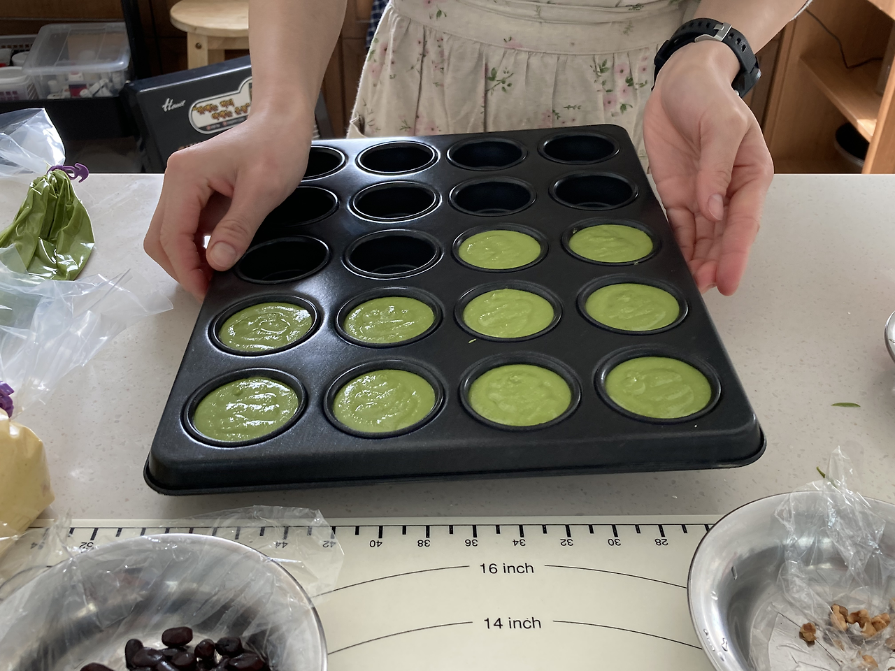 말차 잼 위에 필링 넣어주고 틀을 마저 채워준다. 단, 구워질 때 부풀어 오를 것을 생각해 끝까지 채우지 않는다. 그리고 빈틈이 없도록... 벽을 타고... 한 바퀴 돌리고 지그재그로 마무리...! 말로 설명하기 어려운 만큼 실전도 어려웠다;; (연습만이 살길!!)