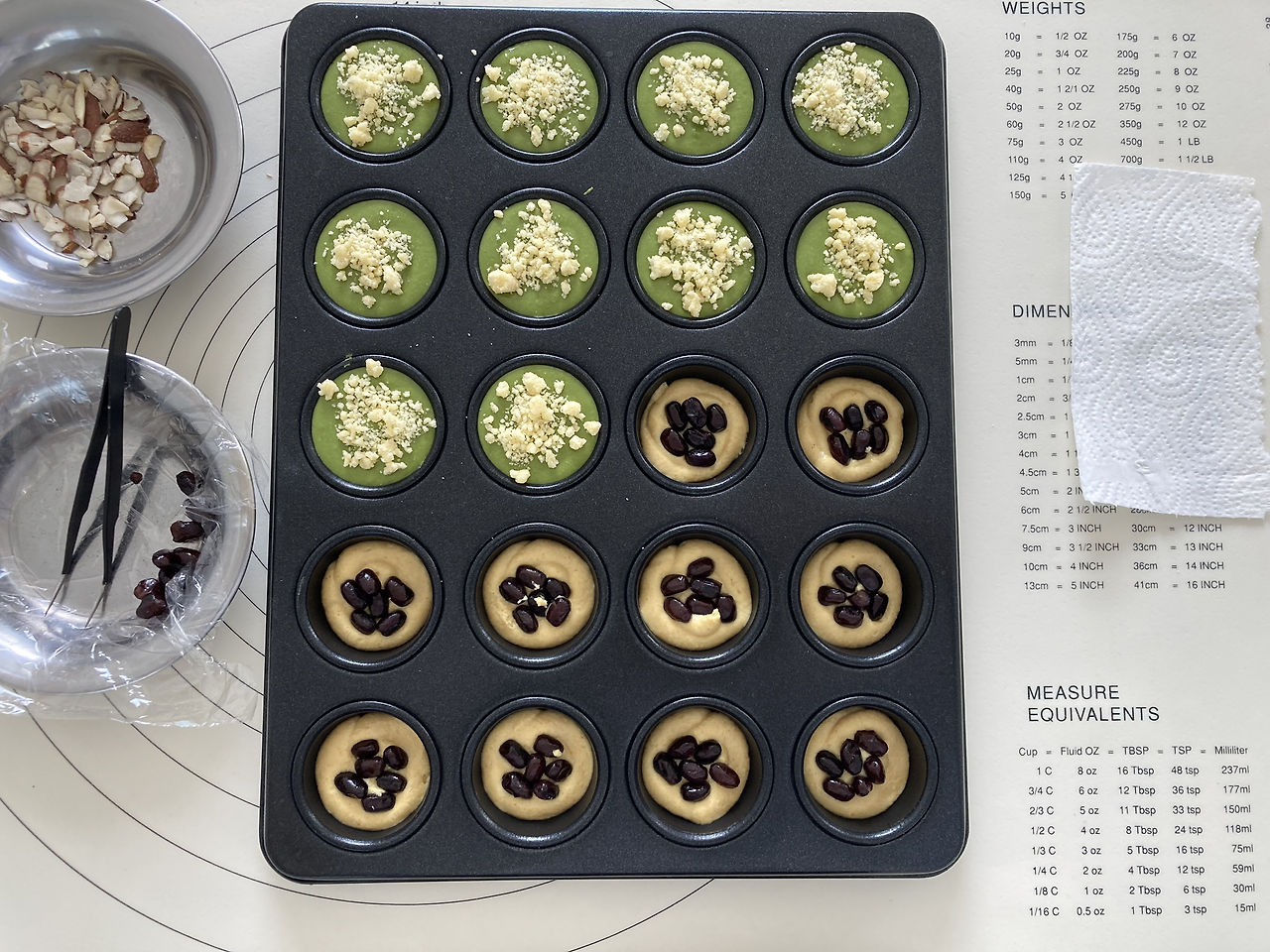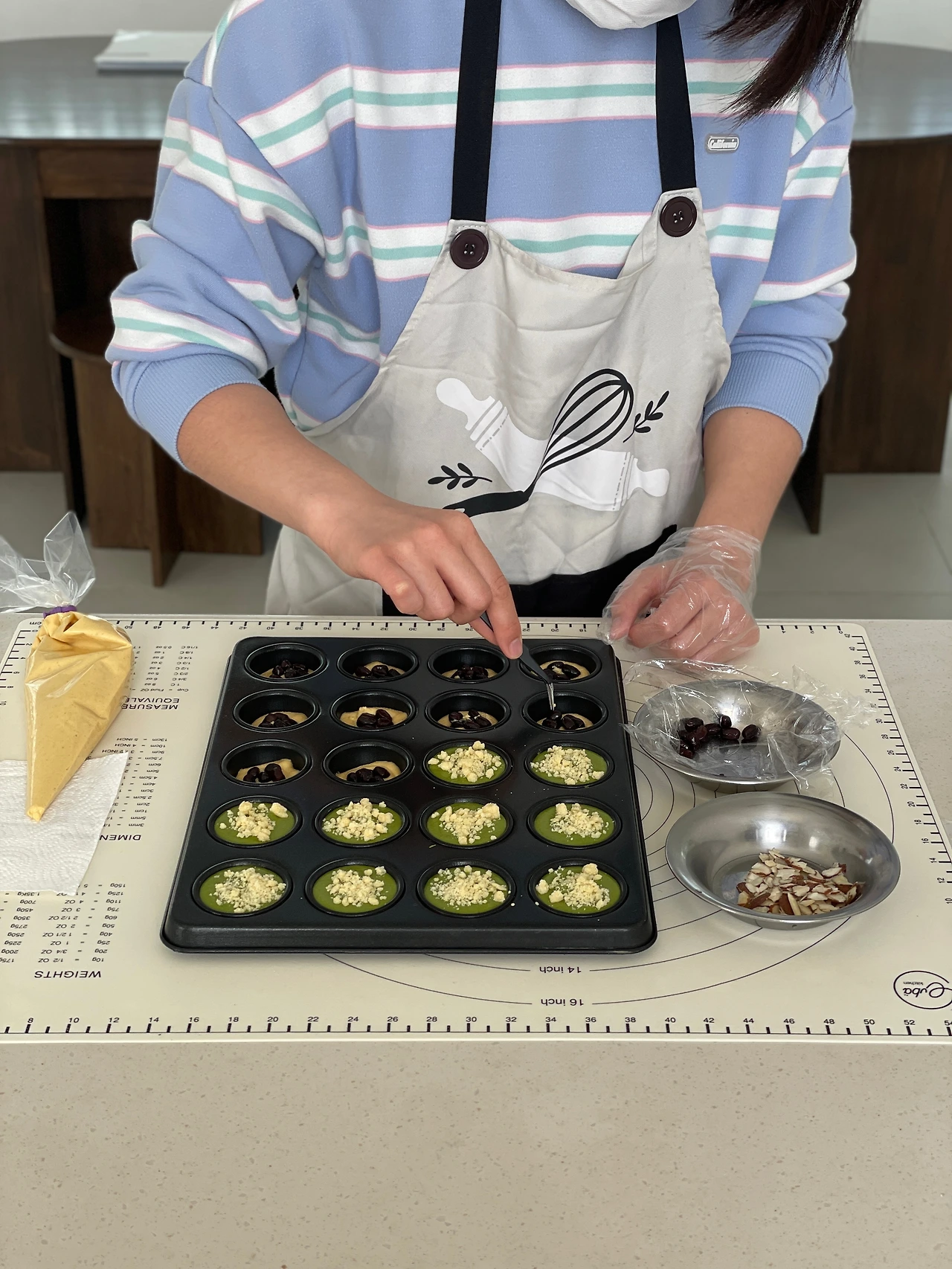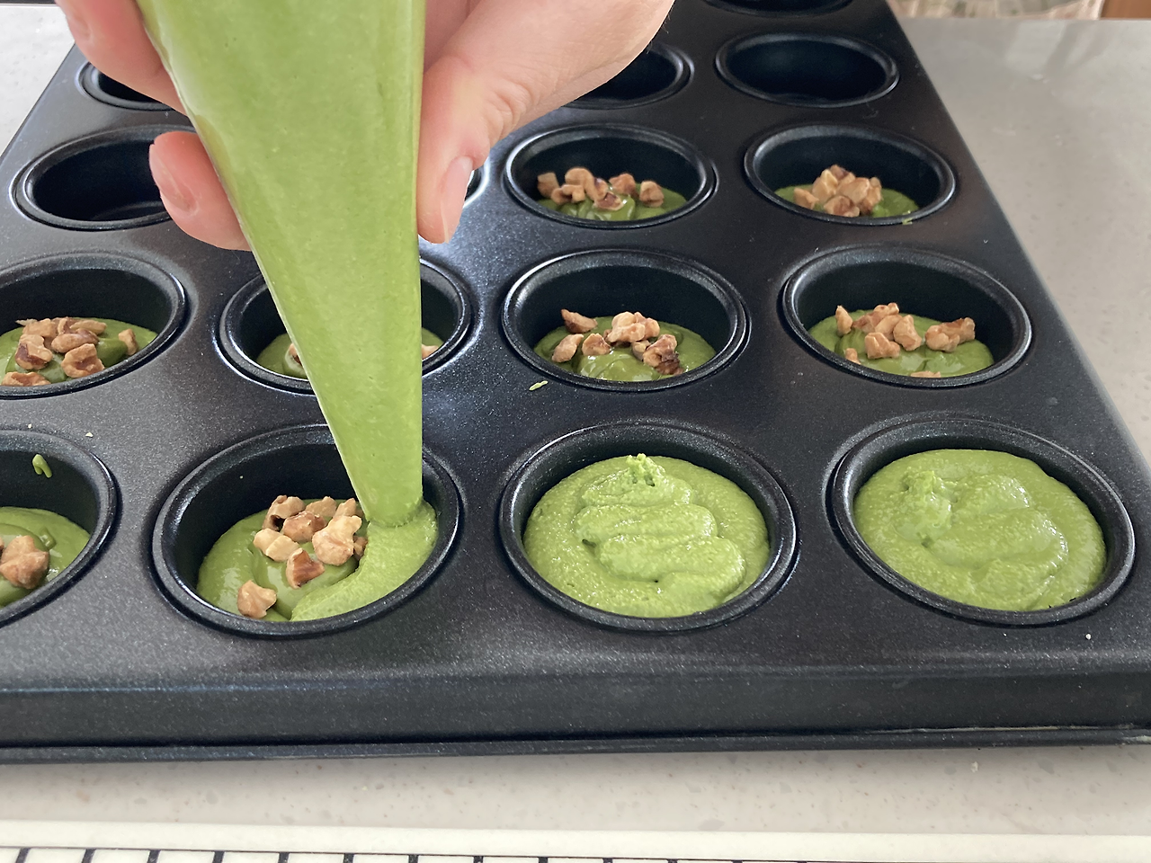 말차 잼 위에 필링 넣어주고 틀을 마저 채워준다. 단, 구워질 때 부풀어 오를 것을 생각해 끝까지 채우지 않는다. 그리고 빈틈이 없도록... 벽을 타고... 한 바퀴 돌리고 지그재그로 마무리...! 말로 설명하기 어려운 만큼 실전도 어려웠다;; (연습만이 살길!!)