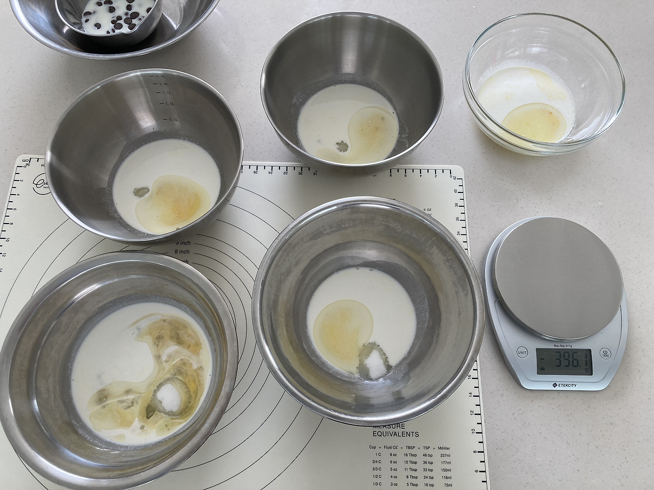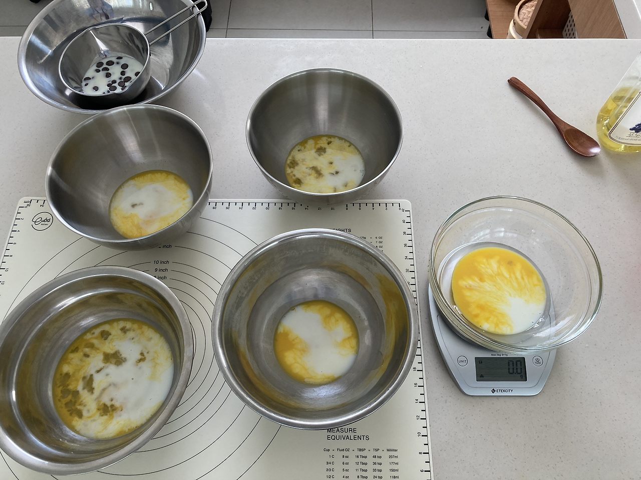 6가지 구움 찰떡을 만들거라 기본 액체류 준비도 한 번에 만들었다. 우유, 전란, 설탕 등등 계량한다.