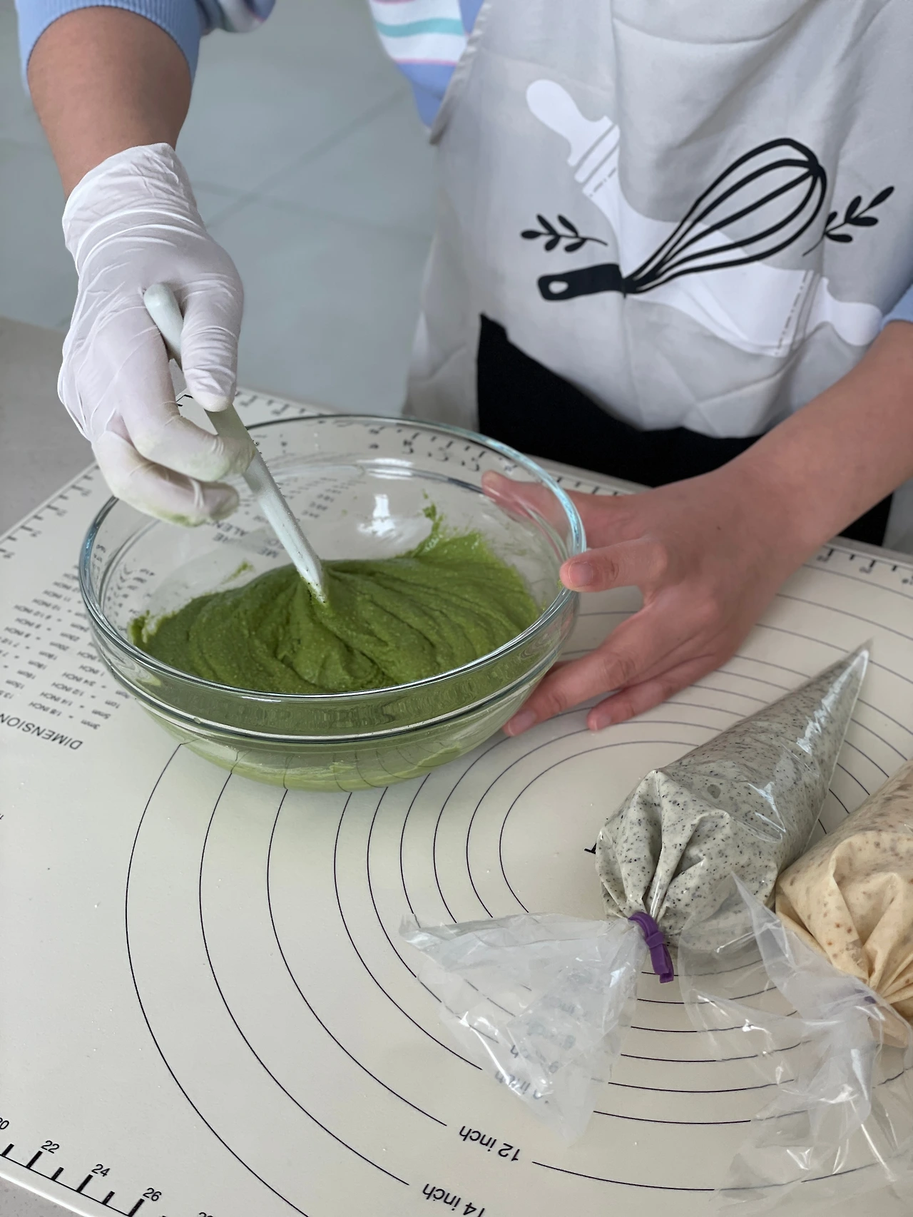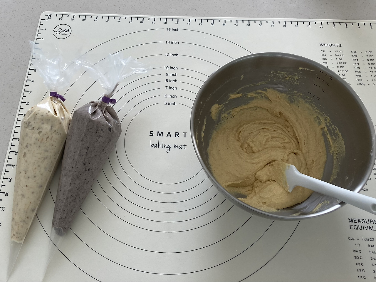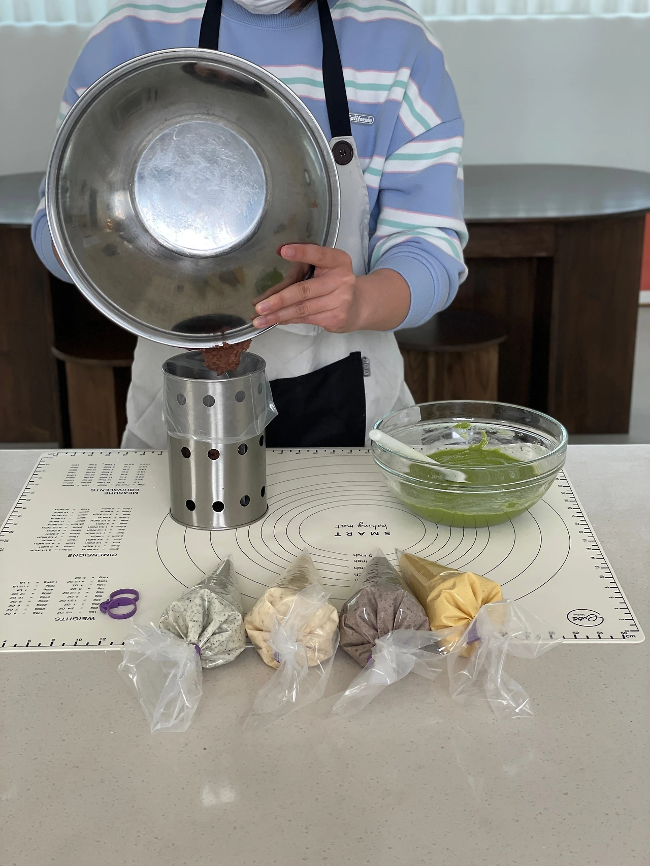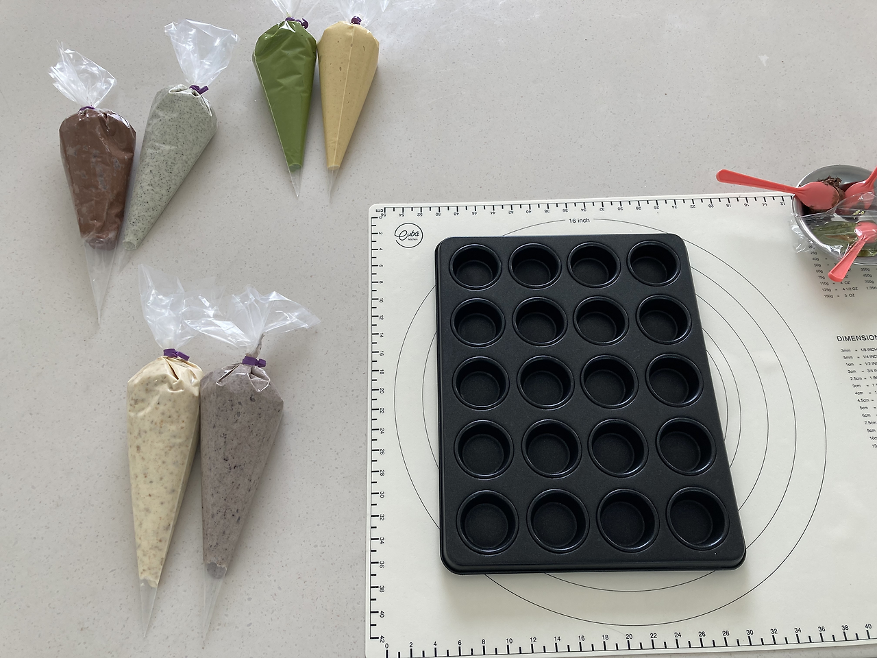 반죽을 두 가지씩 묶어주셨다. 이 짝끼리 머핀틀에 짜면 오븐에서 구울 때 굽기 정도 확인이 더 좋다고 하셨다. (나는 언제쯤 이걸 몸소 깨달을 수 있을지..)