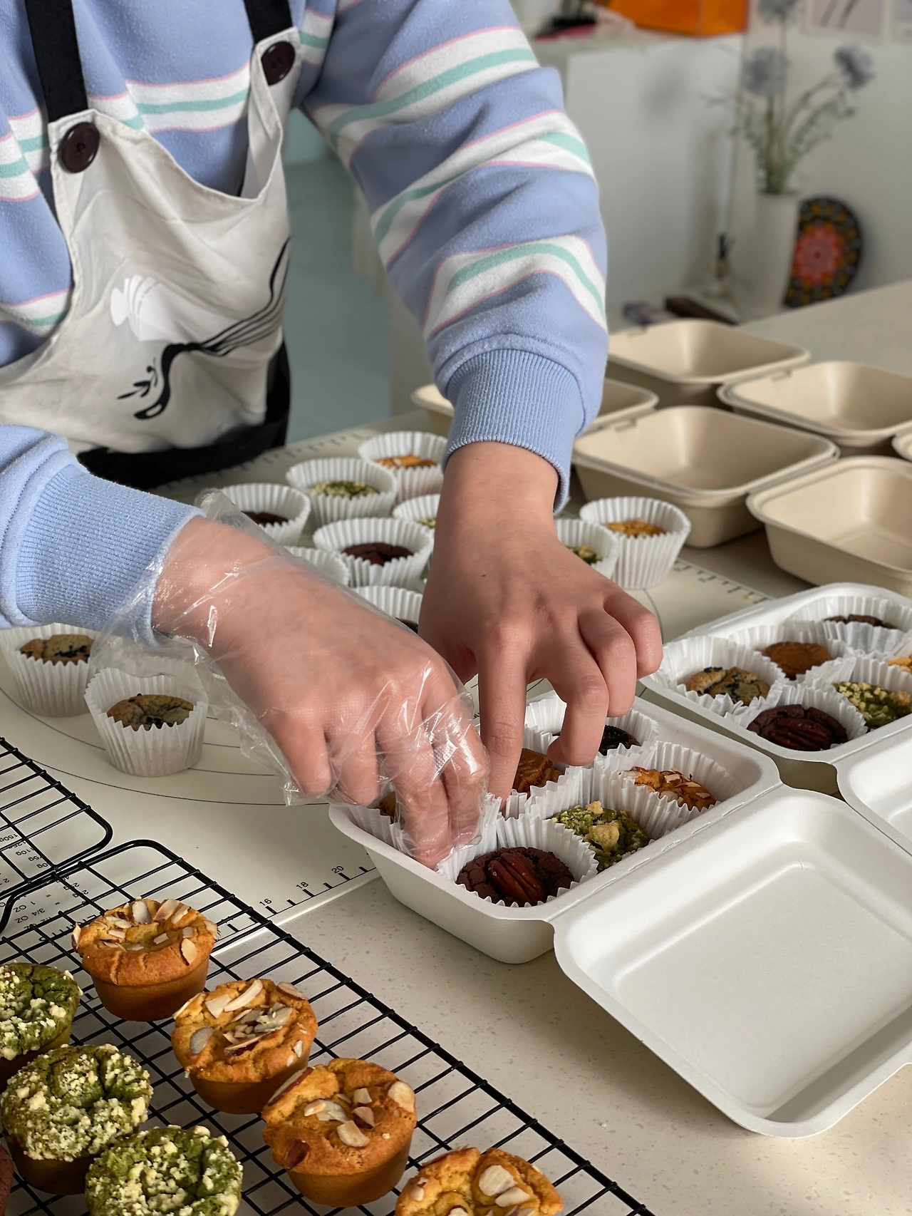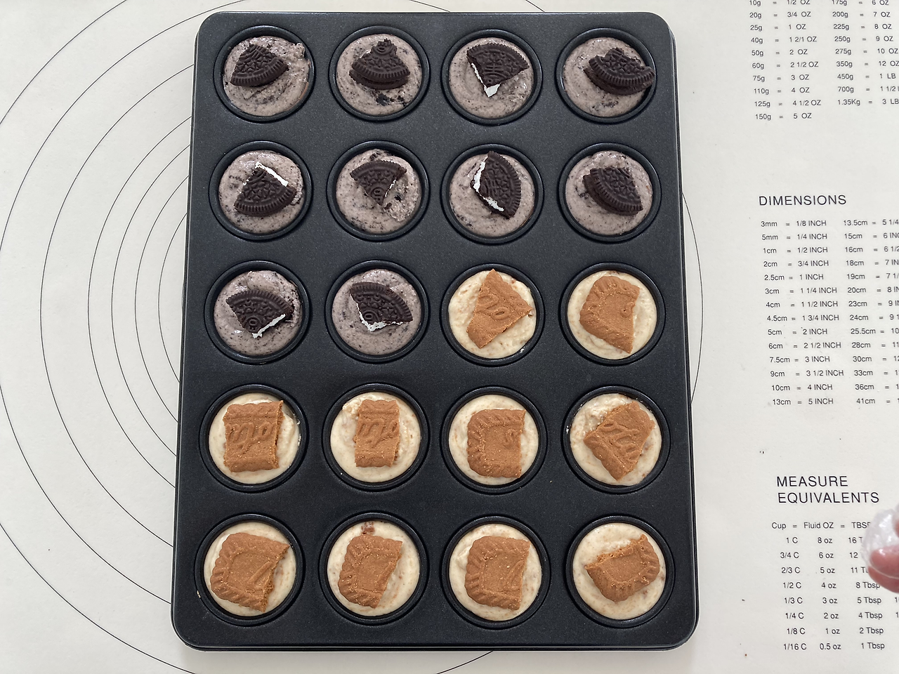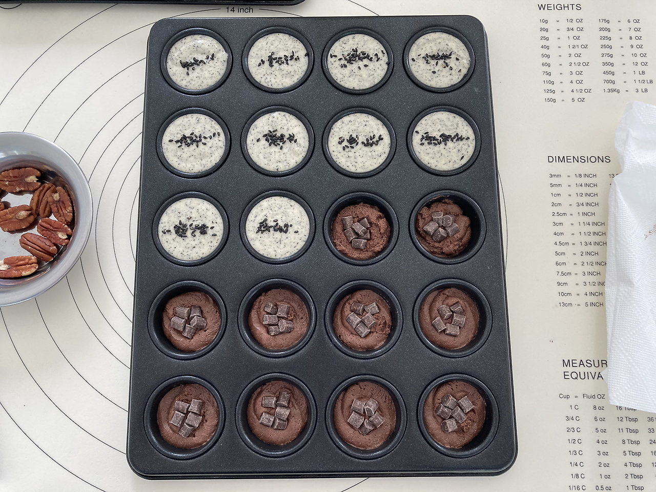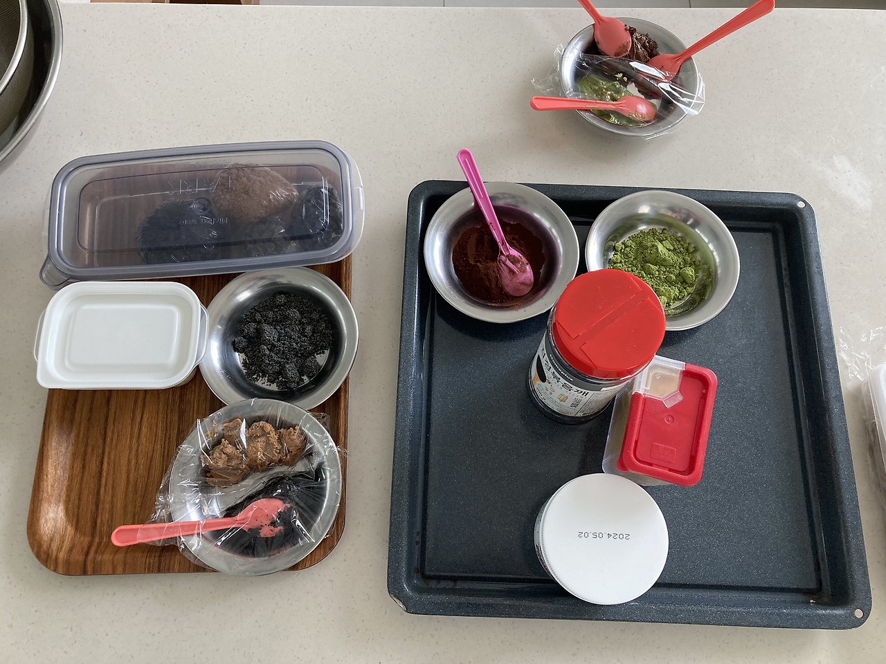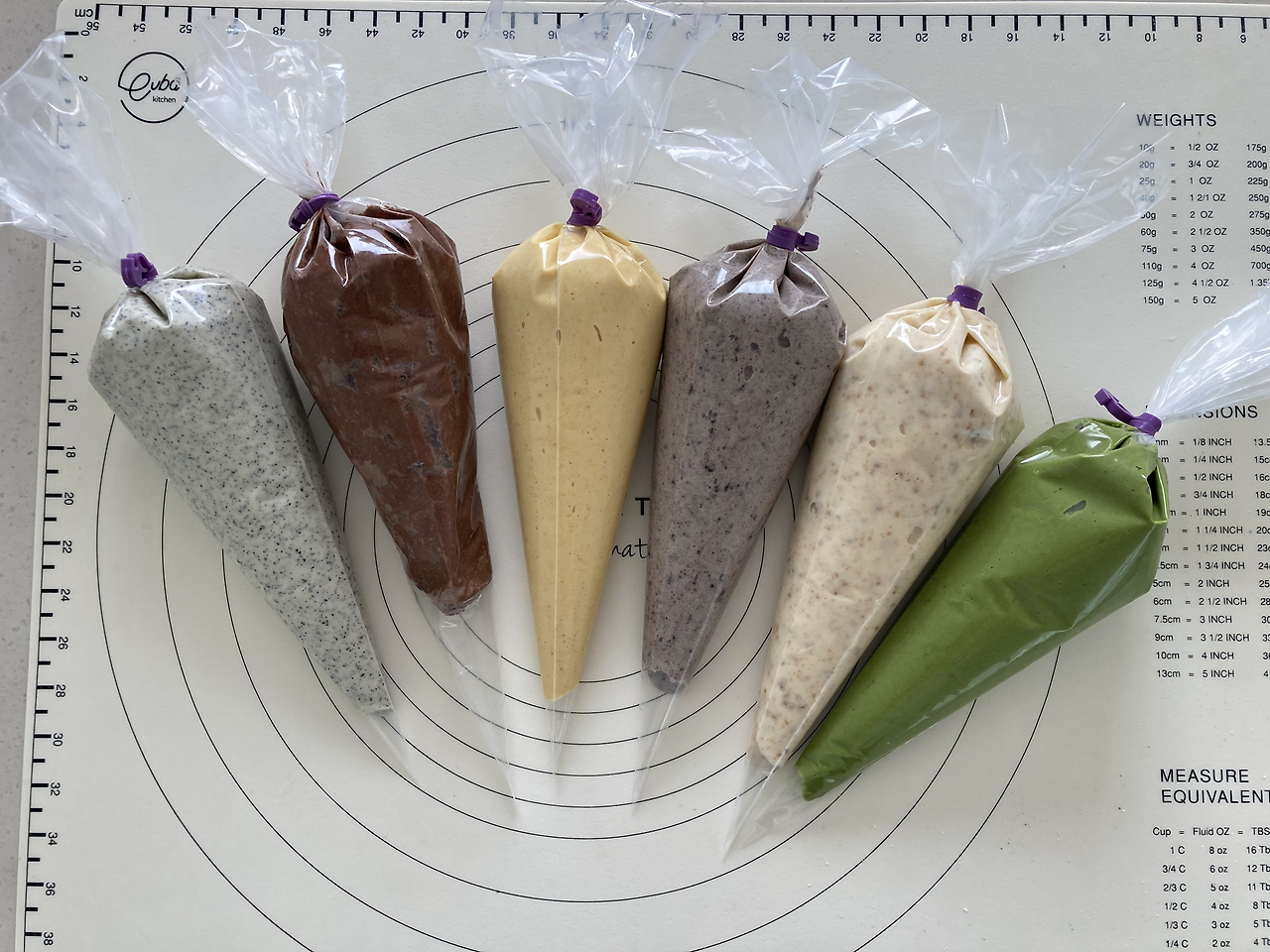 반죽을 두 가지씩 묶어주셨다. 이 짝끼리 머핀틀에 짜면 오븐에서 구울 때 굽기 정도 확인이 더 좋다고 하셨다. (나는 언제쯤 이걸 몸소 깨달을 수 있을지..)