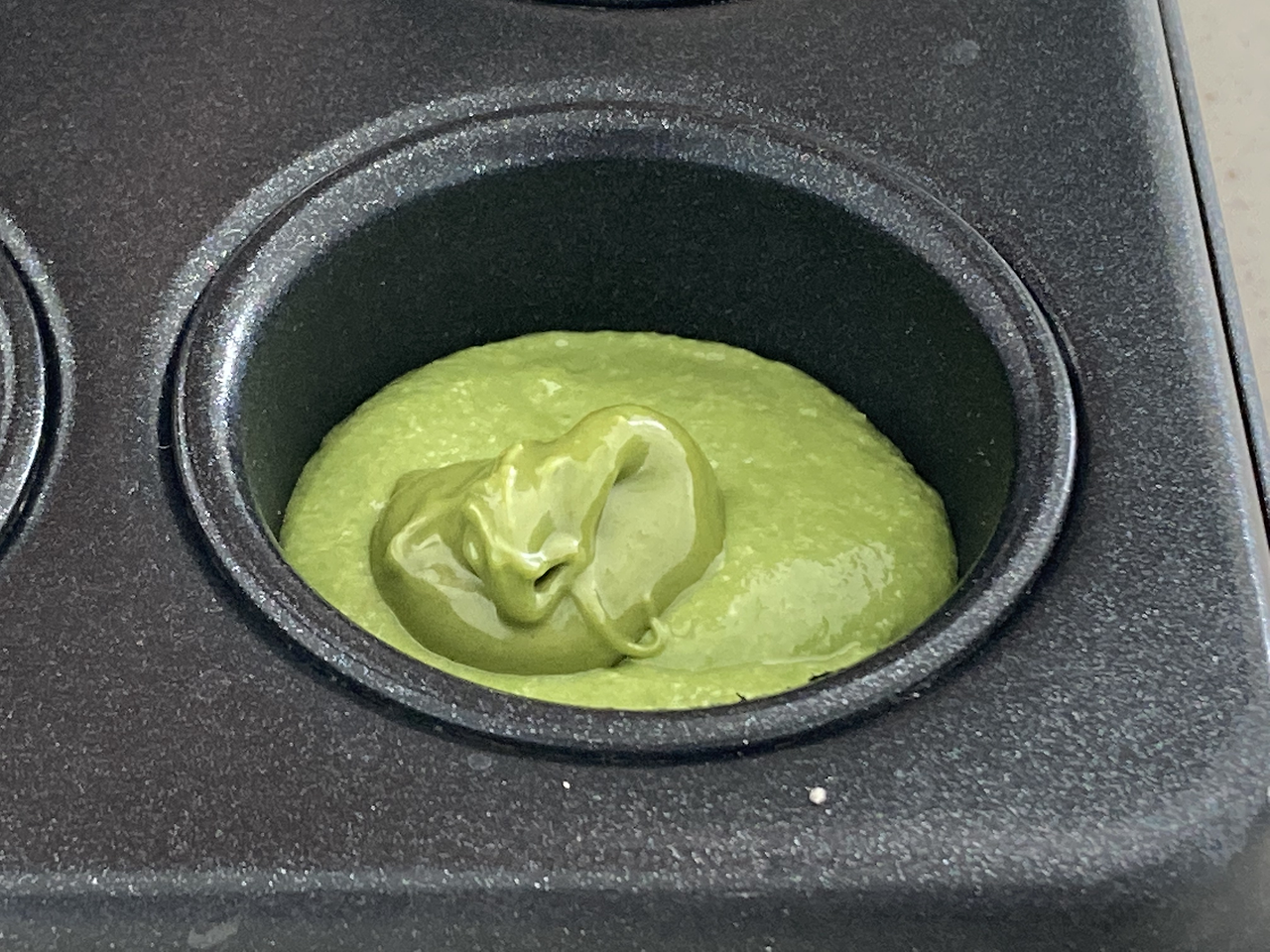 말차 머핀 먼저 시작! 반죽을 머핀틀 반만 채운다. 그리고 말차잼은 이 정도만 넣어주면 된다. 맛있으라고 더 넣었다간 오븐에 구웠을 때 지글지글 끓어서 흐를 수 있다.