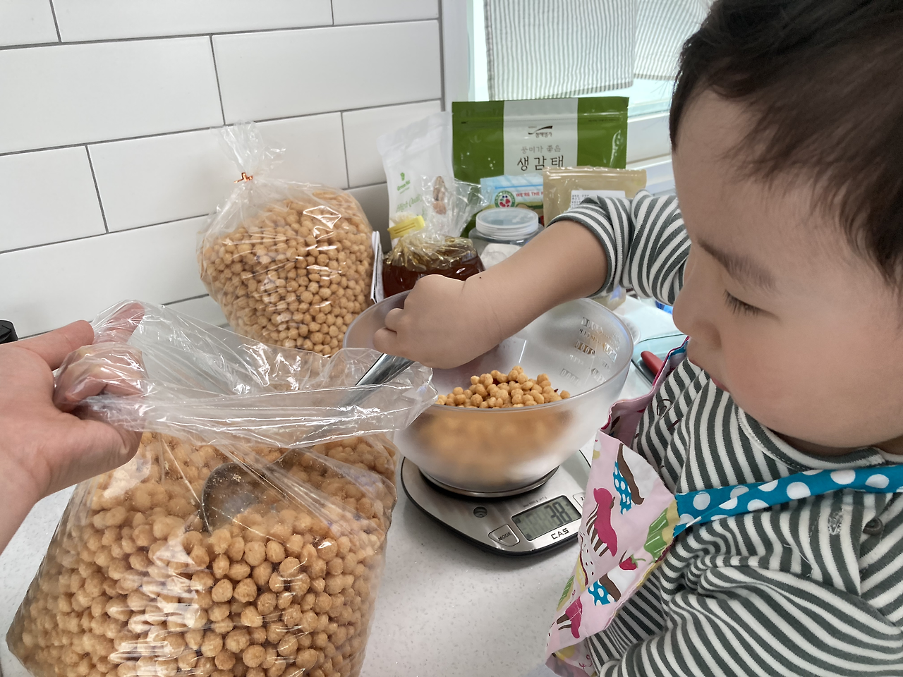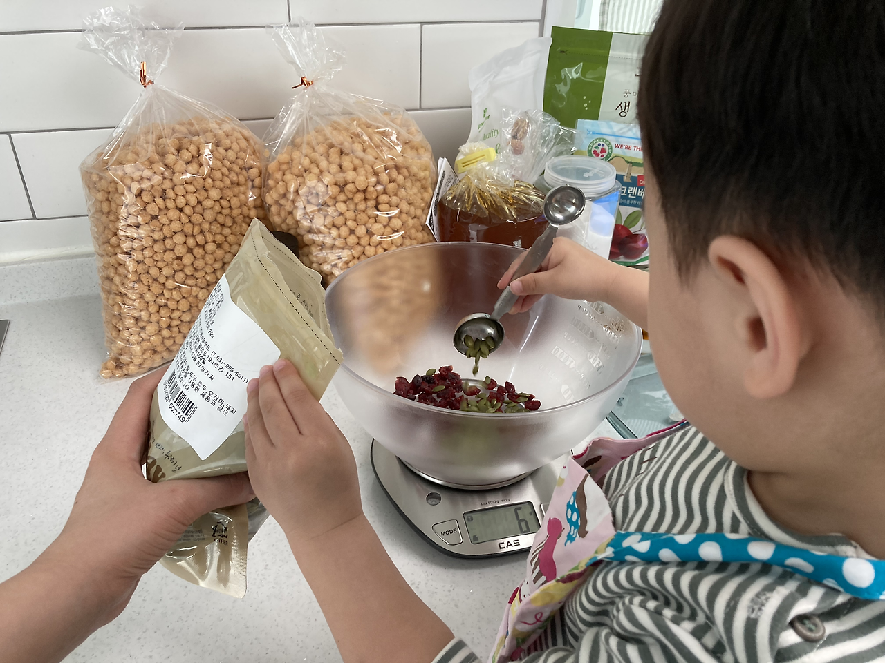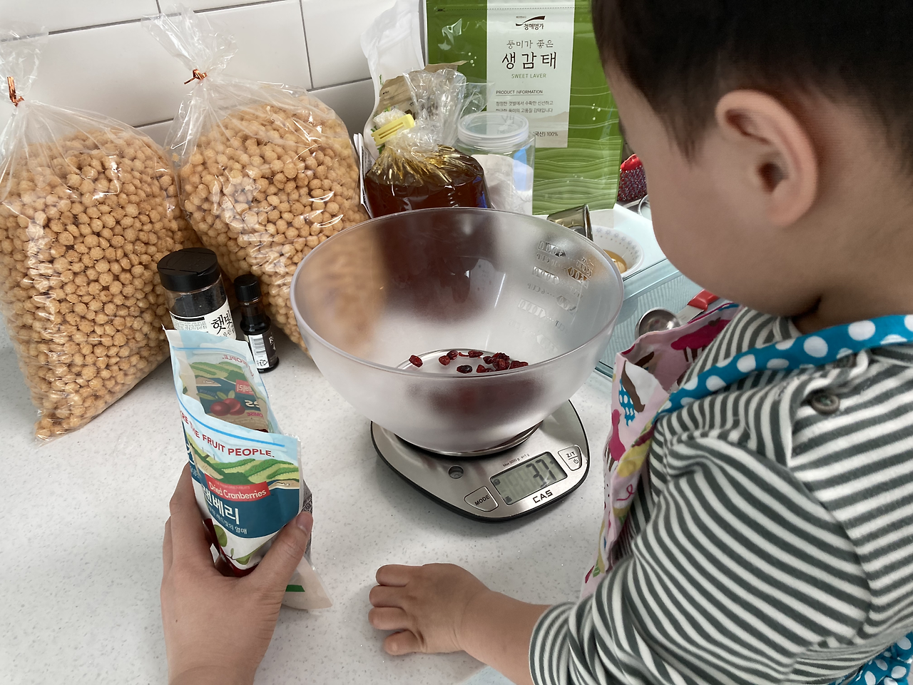 크랜베리&호박씨 쌀오란다를 만들기 위해 재료들을 각각 계량한다. 크랜베리 한 스푼을 볼에 넣고 숫자 확인하는 아드님(숫자라곤 아직 '3'뿐이 모른다). 스스로 부족하다고 판단했는지 다시 크게 한 스푼 떠서 넣어줬다. 우연인지 아닌지는 모르겠지만 얼추 내가 원하는 대로 계량됐다.