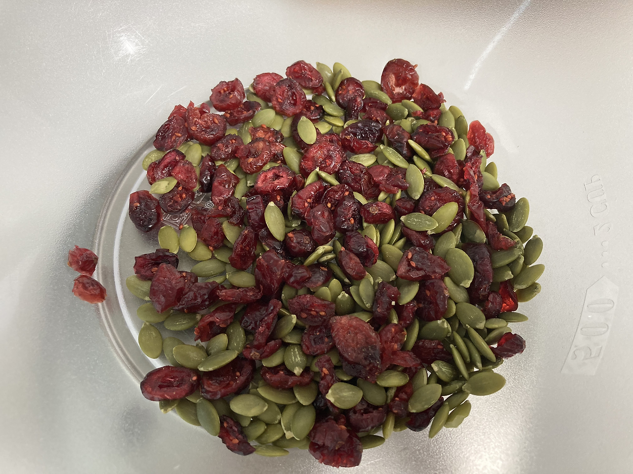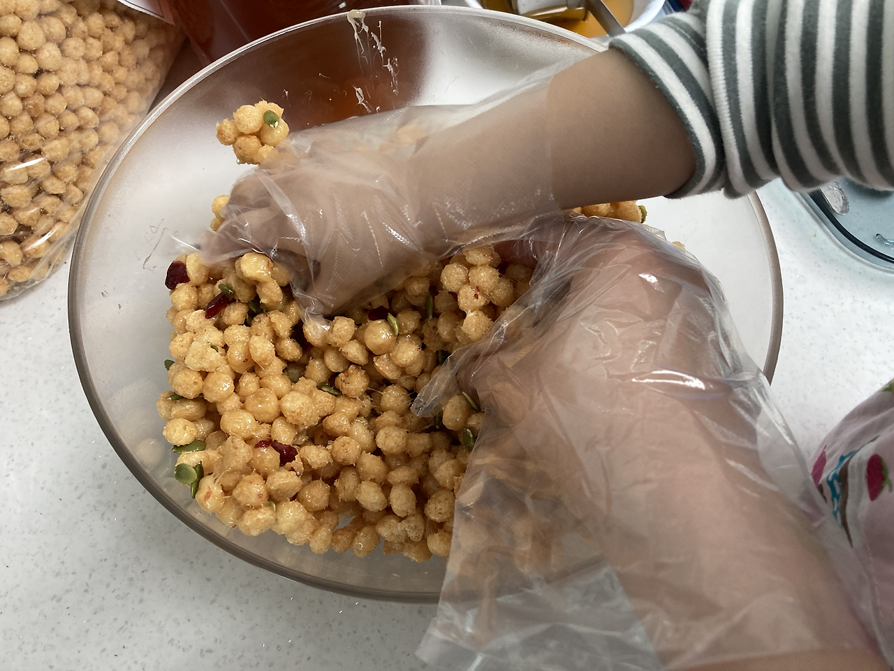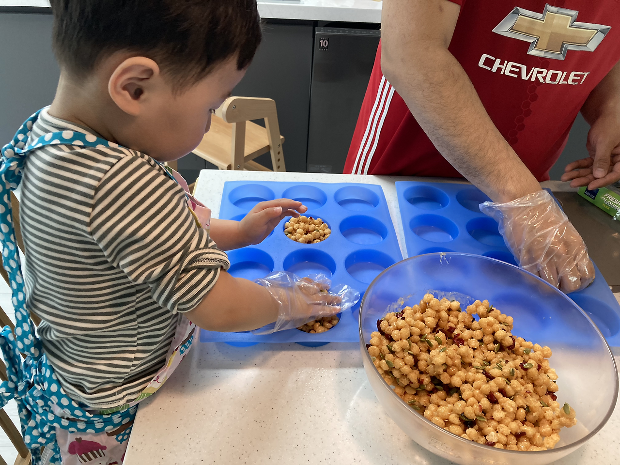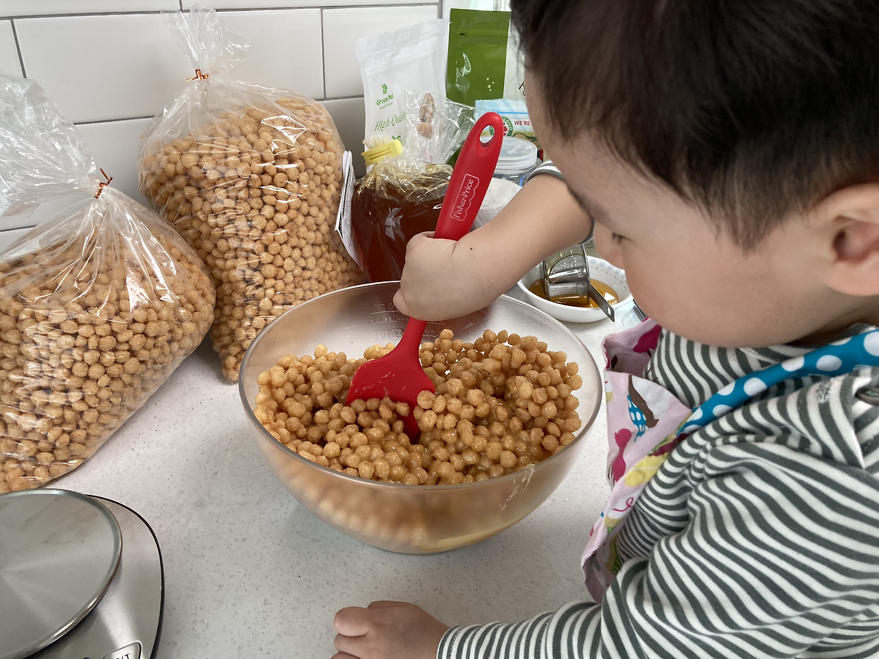 크랜베리&호박씨 쌀오란다를 만들기 위해 재료들을 각각 계량한다. 크랜베리 한 스푼을 볼에 넣고 숫자 확인하는 아드님(숫자라곤 아직 '3'뿐이 모른다). 스스로 부족하다고 판단했는지 다시 크게 한 스푼 떠서 넣어줬다. 우연인지 아닌지는 모르겠지만 얼추 내가 원하는 대로 계량됐다.