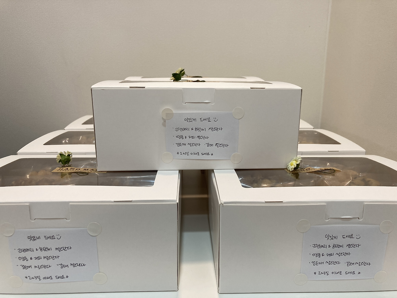 상자에 10개씩 다 넣었고 기뻤지만 2% 부족해 보였다. 그래서 처음엔 메모지에 몇 자 적어서 투명창에 붙였다. 내 기준엔 성의 없이 보이는 것 같아 좀 더 정성을 들였다.