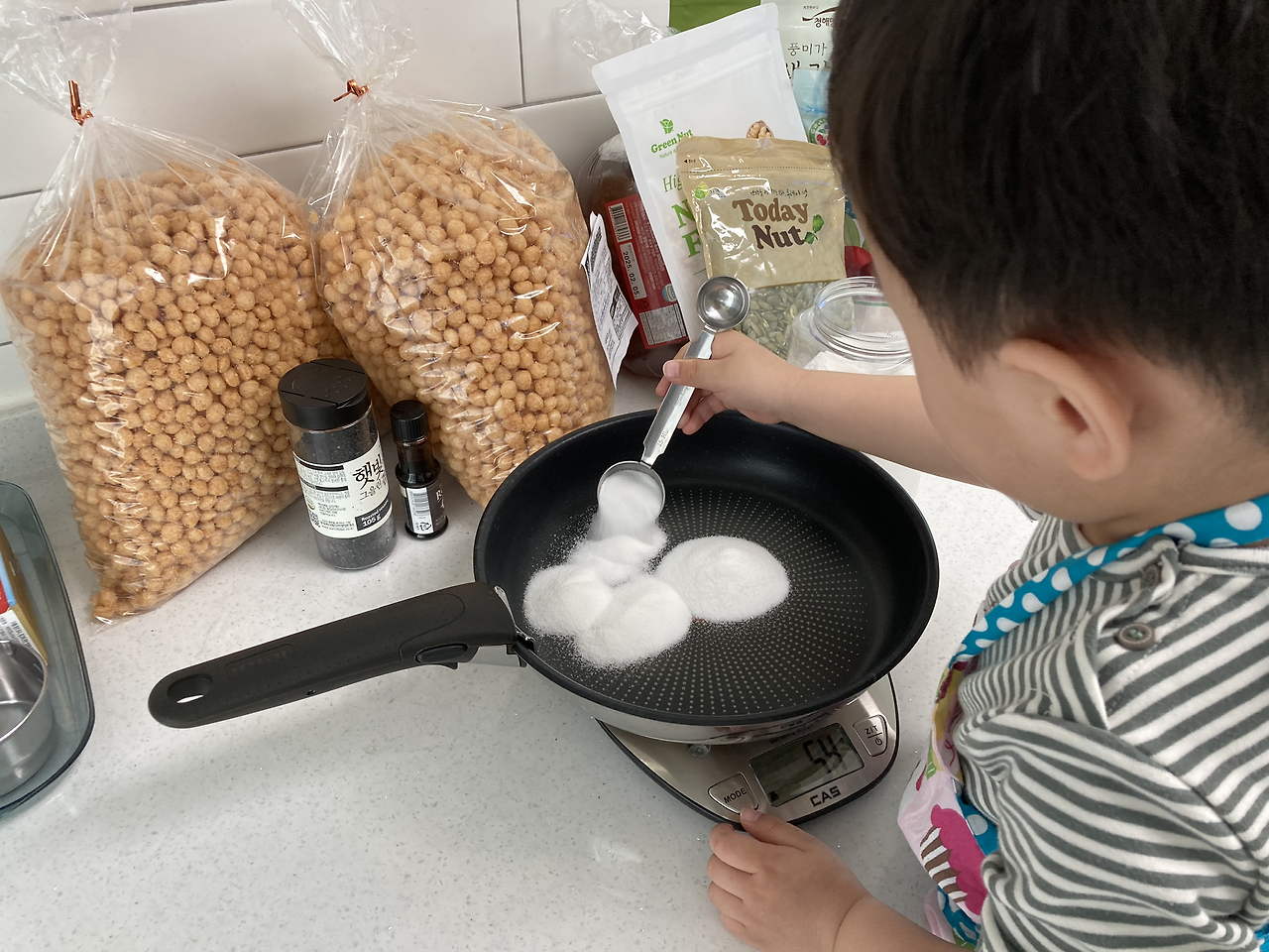 아들이 도와주겠다고 앞치마 입고 내 옆으로 의자 끌고 와서는 대기하고 있었다. 계량하는 것과 섞어주는 건 아들도 할 수 있을 것 같아 흔쾌히 허락했다. 먼저 스푼으로 설탕을 계량한다.