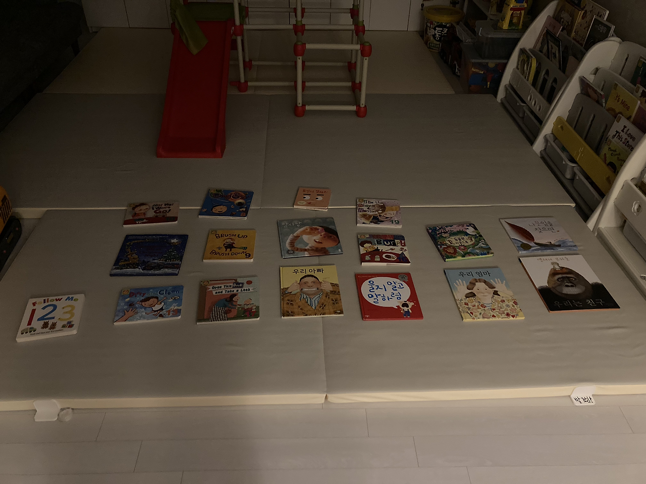 내일 아침의 ‘북모닝’을 위해 장난감들 정리 후 아가들이 빼놓은 책들을 매트 위에 가지런히 펼쳐놓았다.