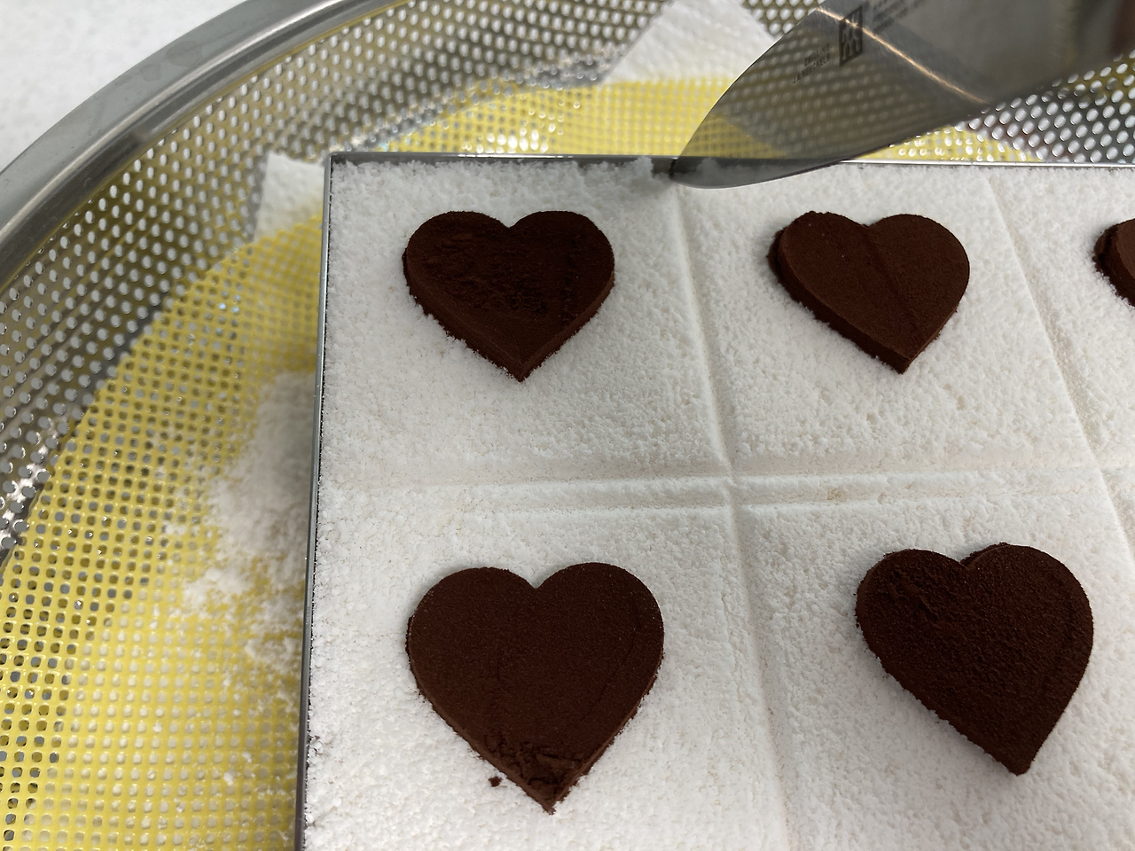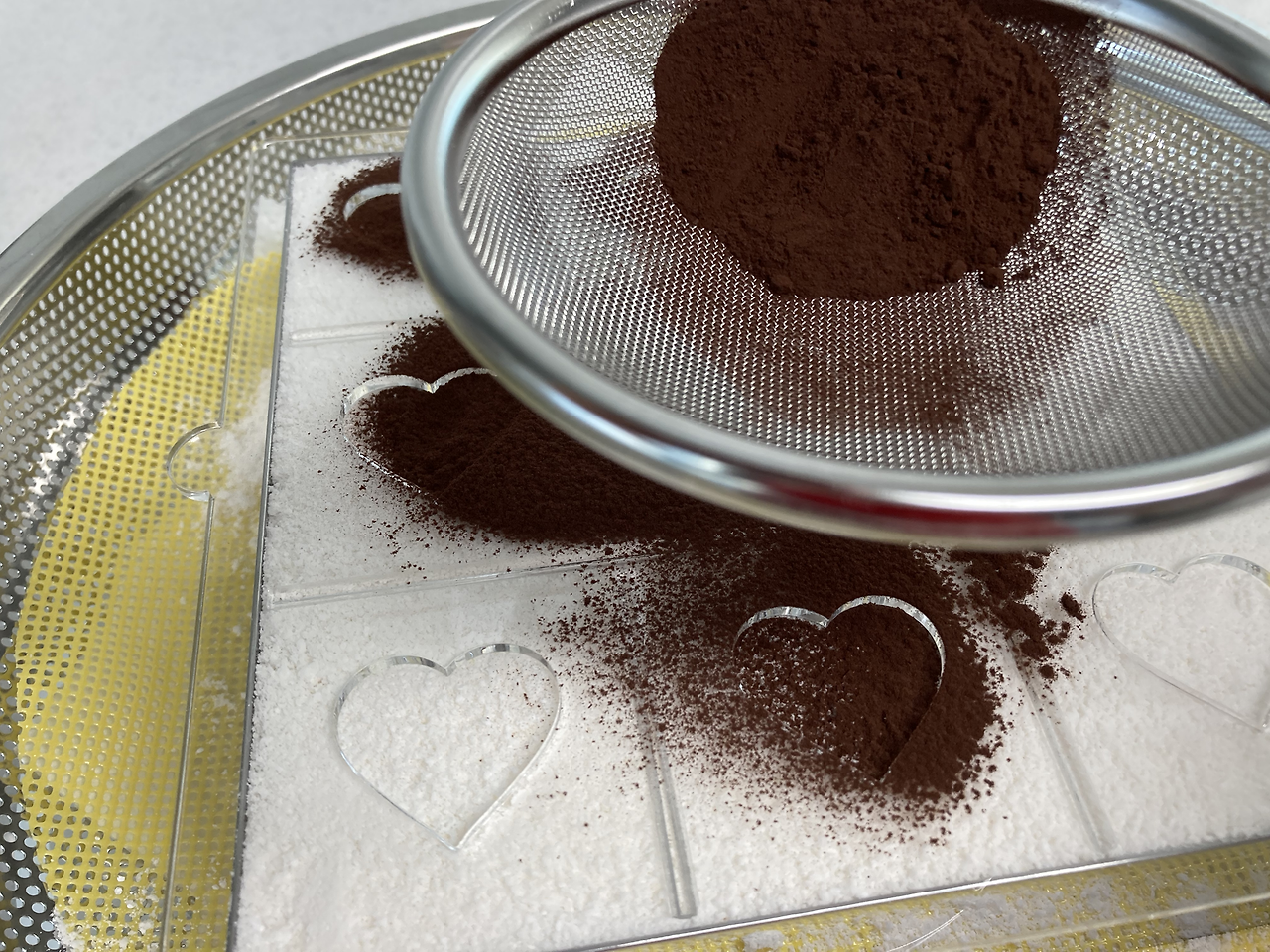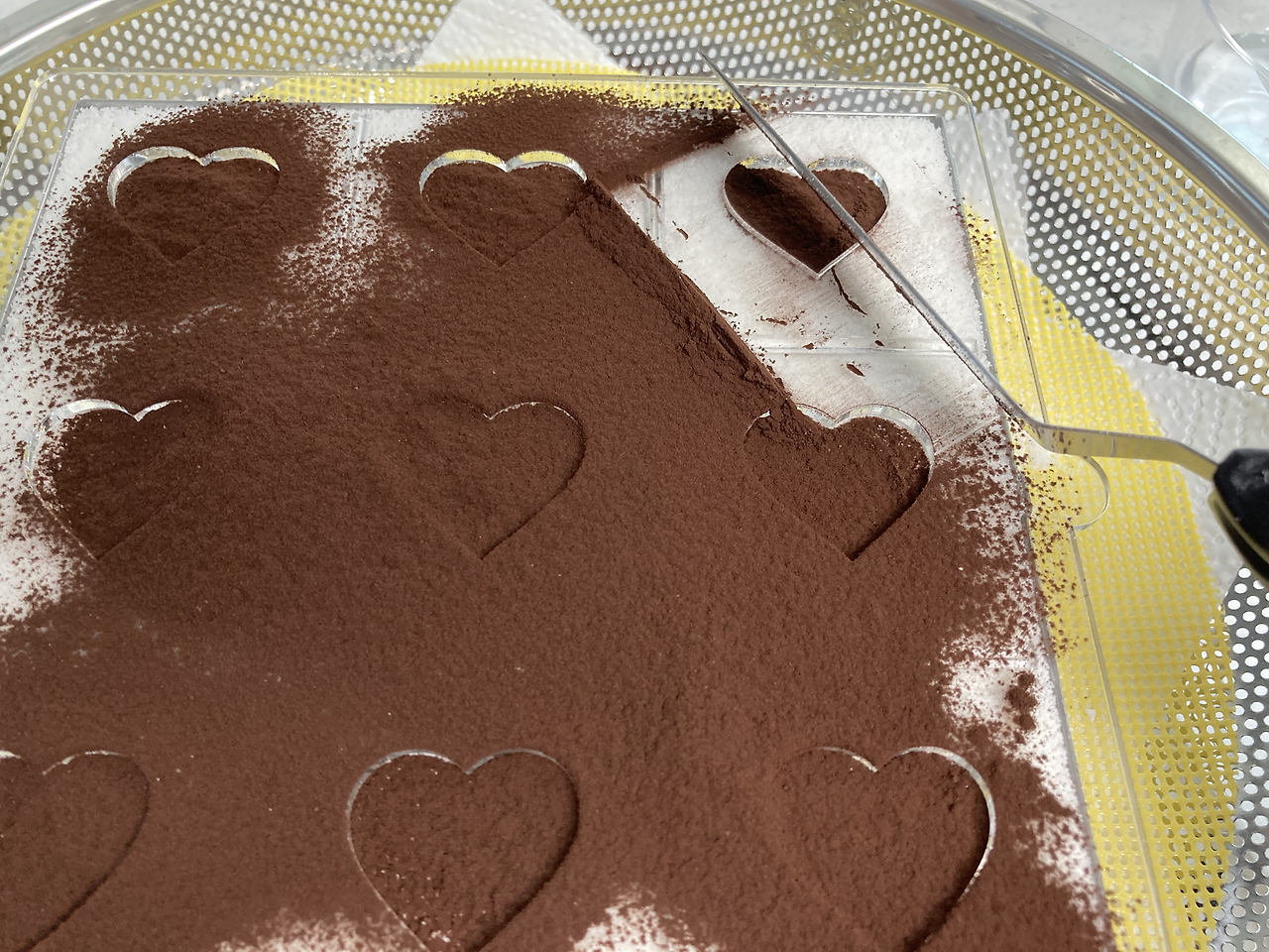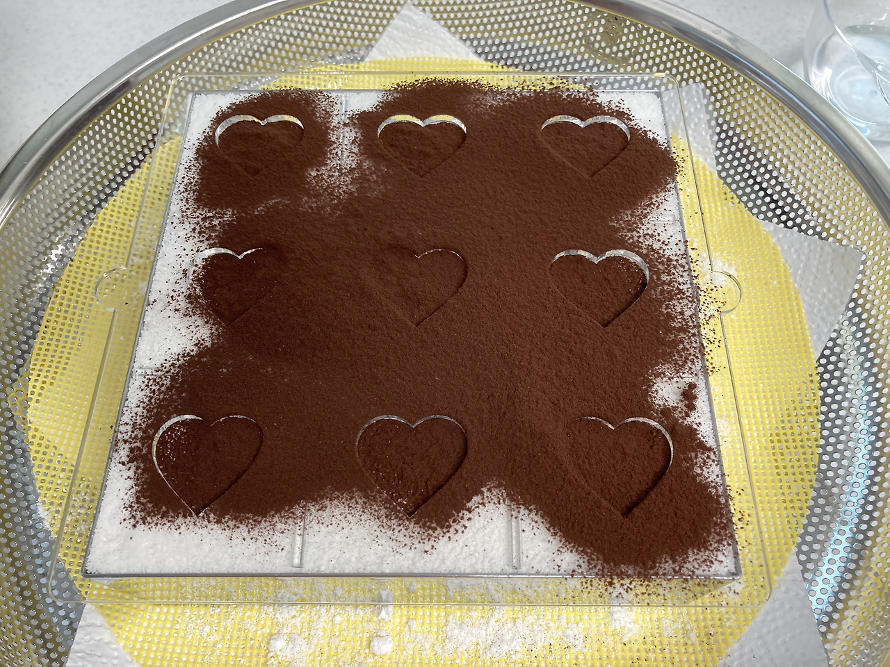 15) 하트 칼금판을 올려두고 코코아 가루 뿌리기
