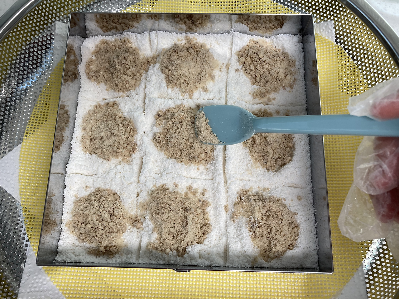 11) 칼금 그은 후 손가락으로 각 칸 안에 꿀필링 넣을 얕은 구멍 만들기