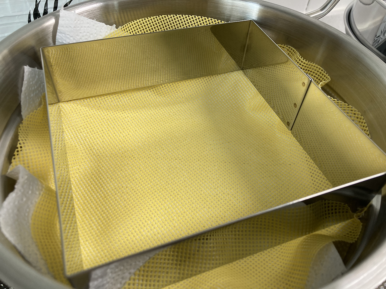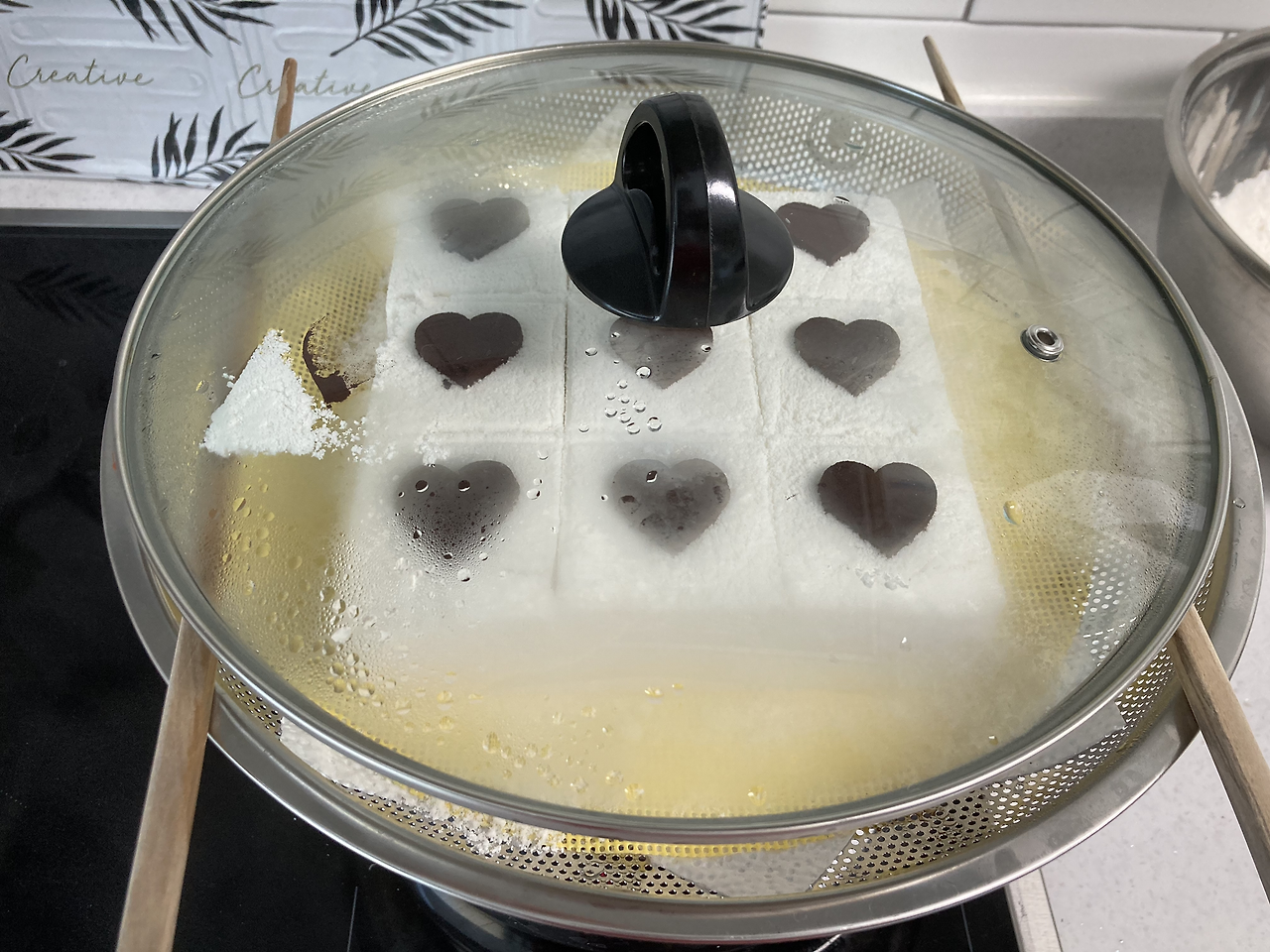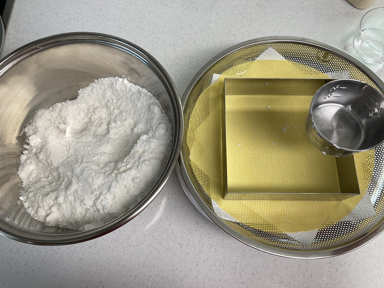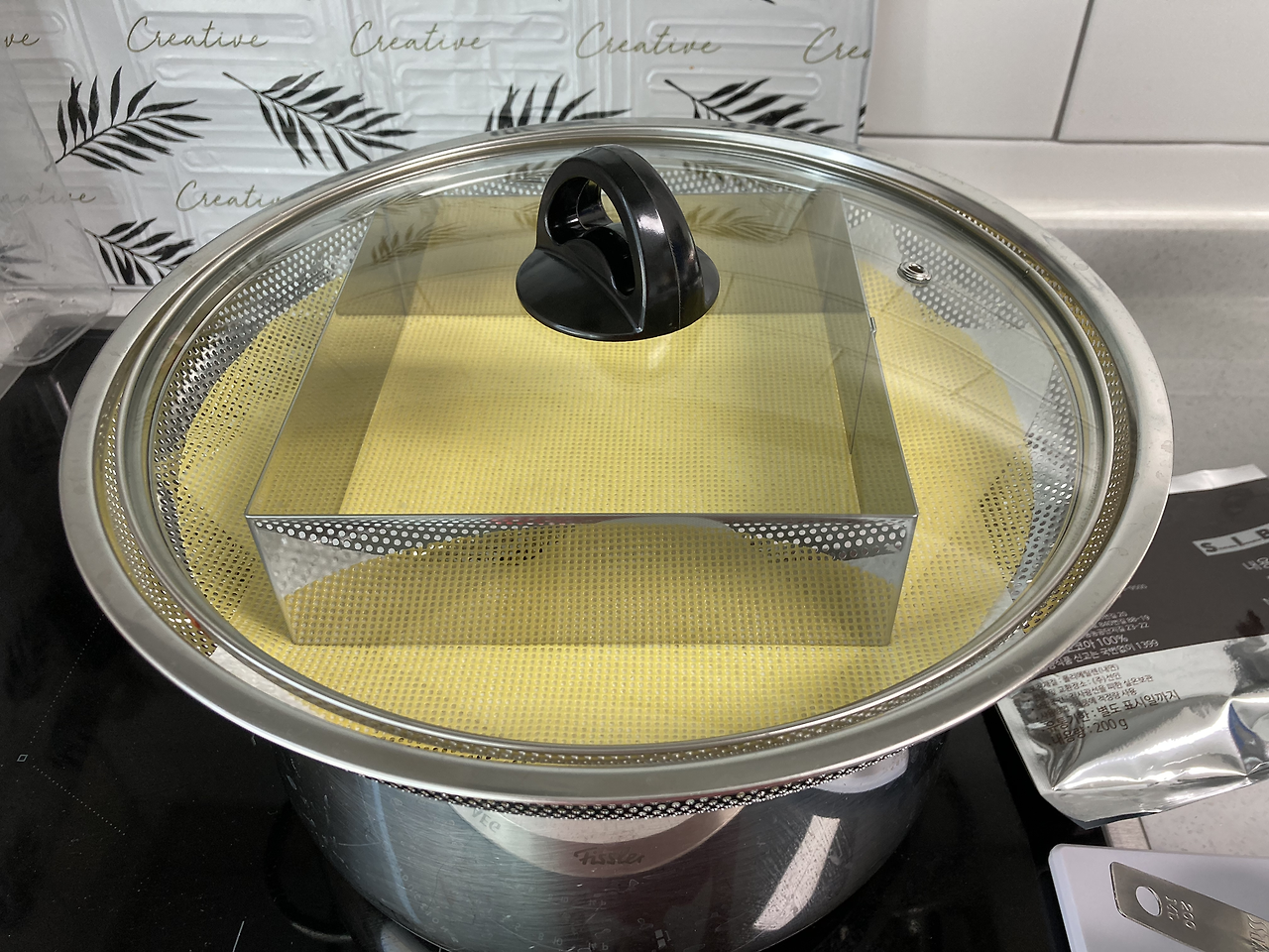 사진상으로 잘 보일지 모르겠지만 찜통 내부 크기보다 사각 무스틀(가로 16.5 x 세로 16.5 x 높이 5cm)이 더 넓어서 바닥에 닿지 않았다. 그래서 무스틀보다는 넣은 체를 찜통 위에 올려놓고 찜통 뚜껑을 닫았는데 뚜껑이 틀에 완전히 닿기도 하고 옆에 뚫려있는 구멍들이 거슬렸다. 일단 문제가 있는 건 알았으니 떡 만들 준비를 시작했다.