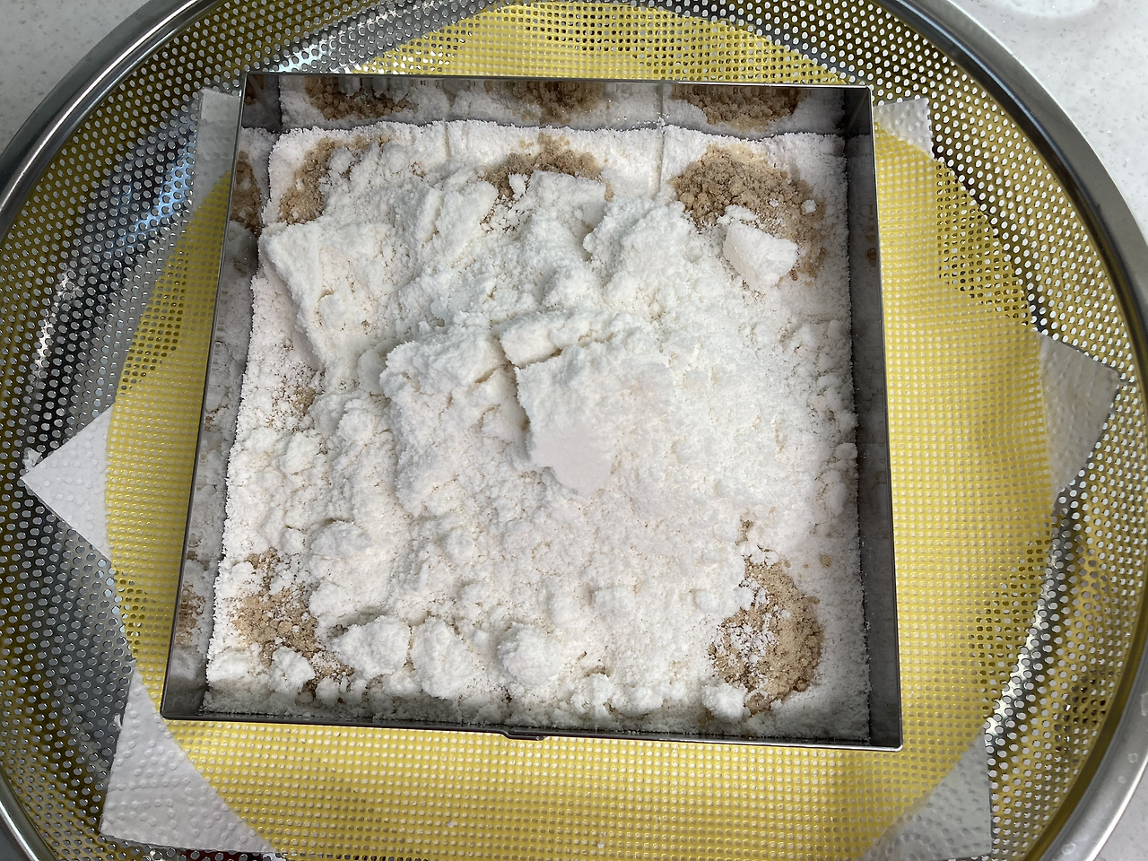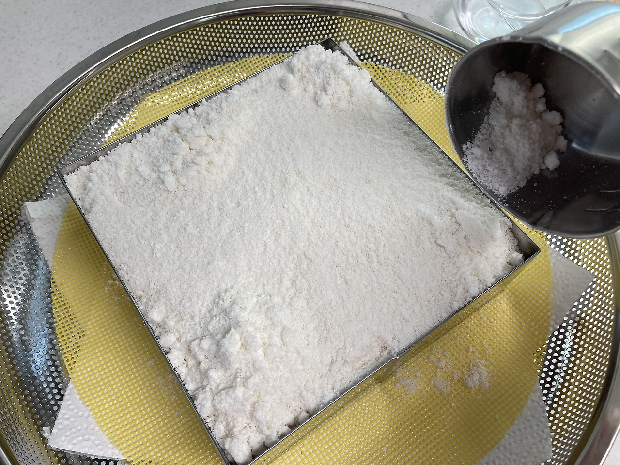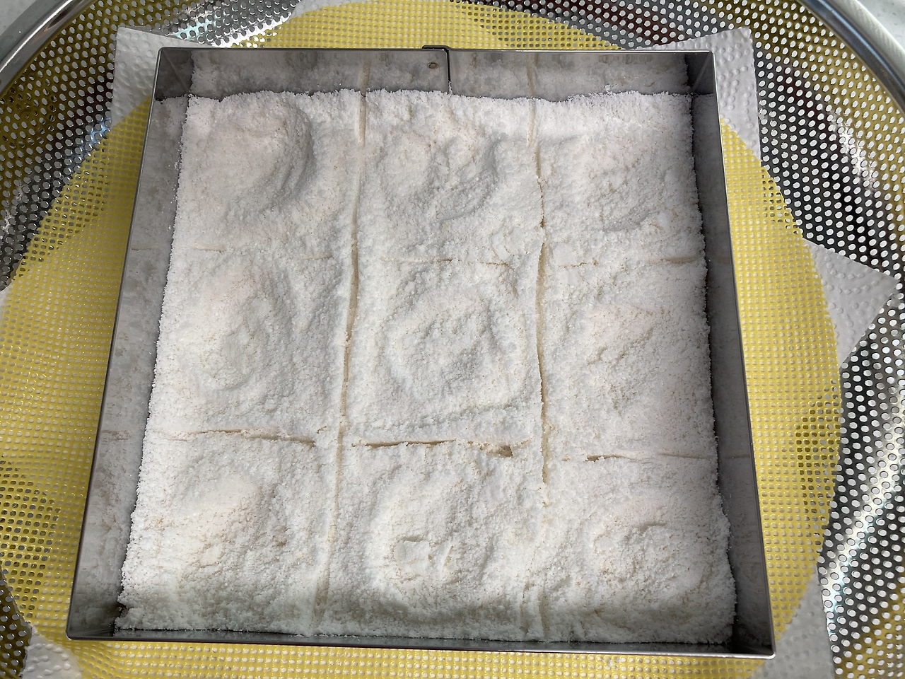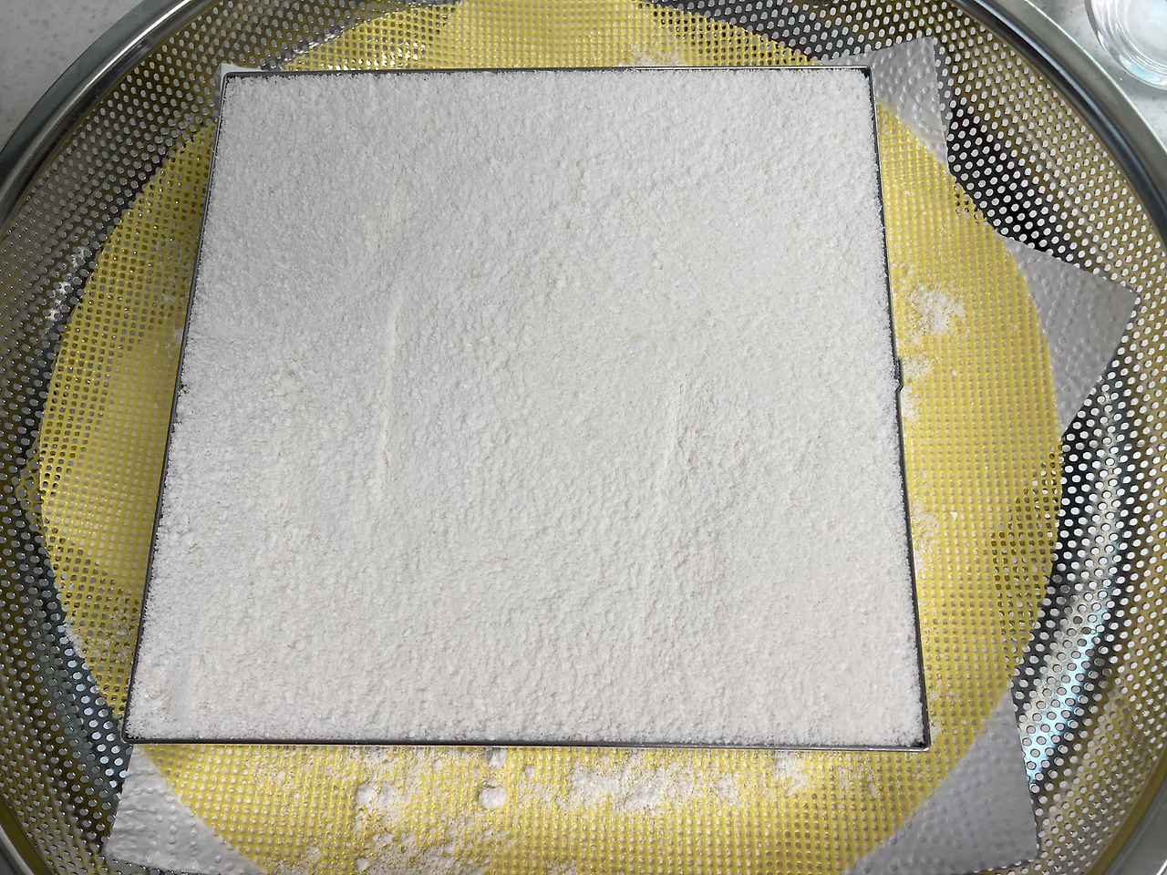 사진상으로 잘 보일지 모르겠지만 찜통 내부 크기보다 사각 무스틀(가로 16.5 x 세로 16.5 x 높이 5cm)이 더 넓어서 바닥에 닿지 않았다. 그래서 무스틀보다는 넣은 체를 찜통 위에 올려놓고 찜통 뚜껑을 닫았는데 뚜껑이 틀에 완전히 닿기도 하고 옆에 뚫려있는 구멍들이 거슬렸다. 일단 문제가 있는 건 알았으니 떡 만들 준비를 시작했다.