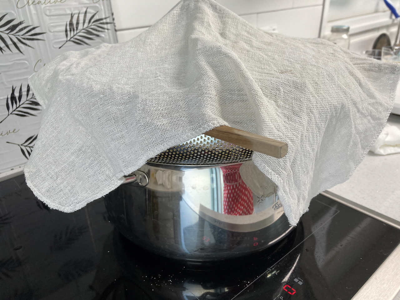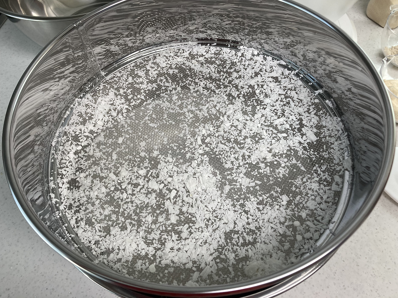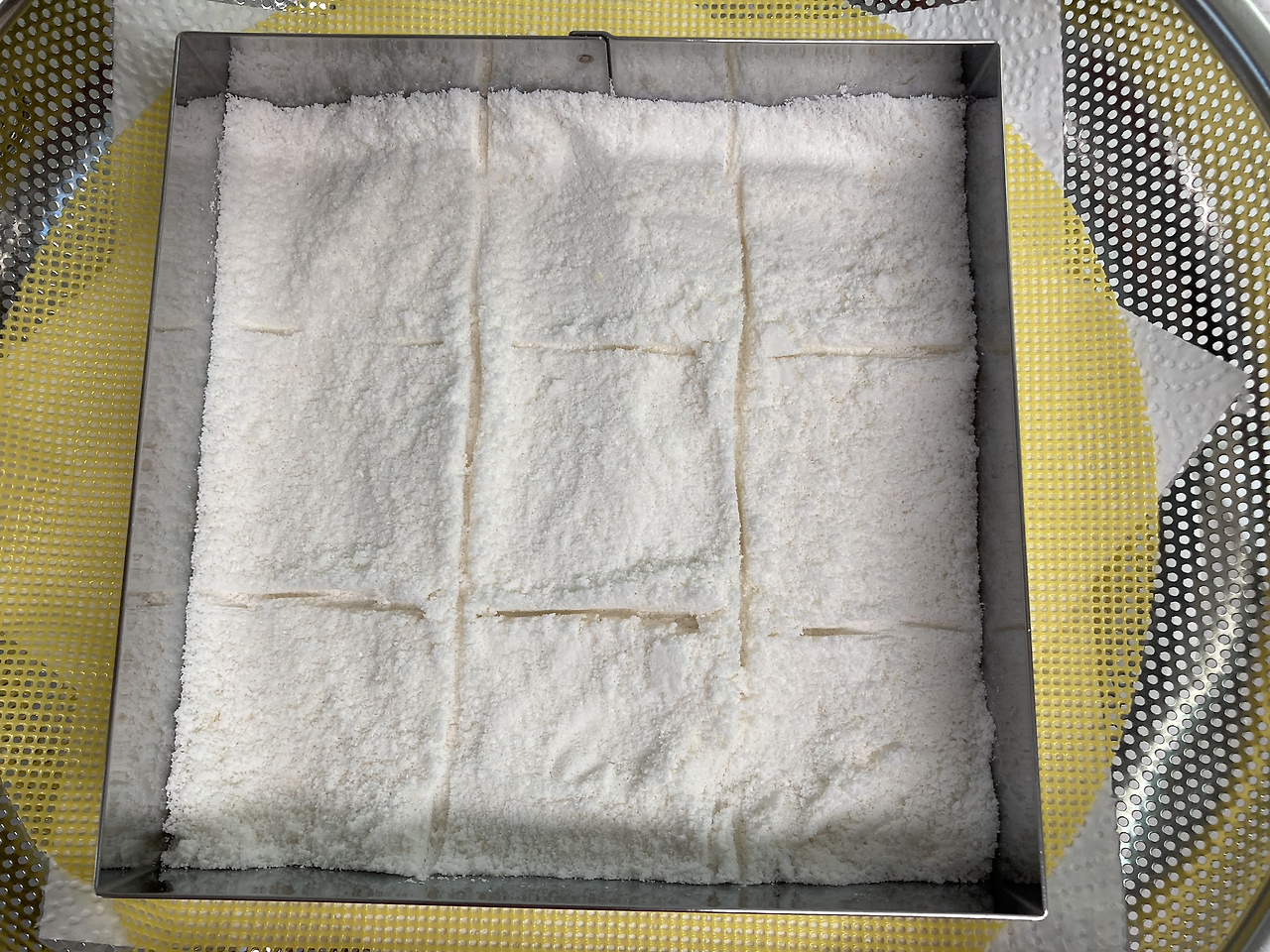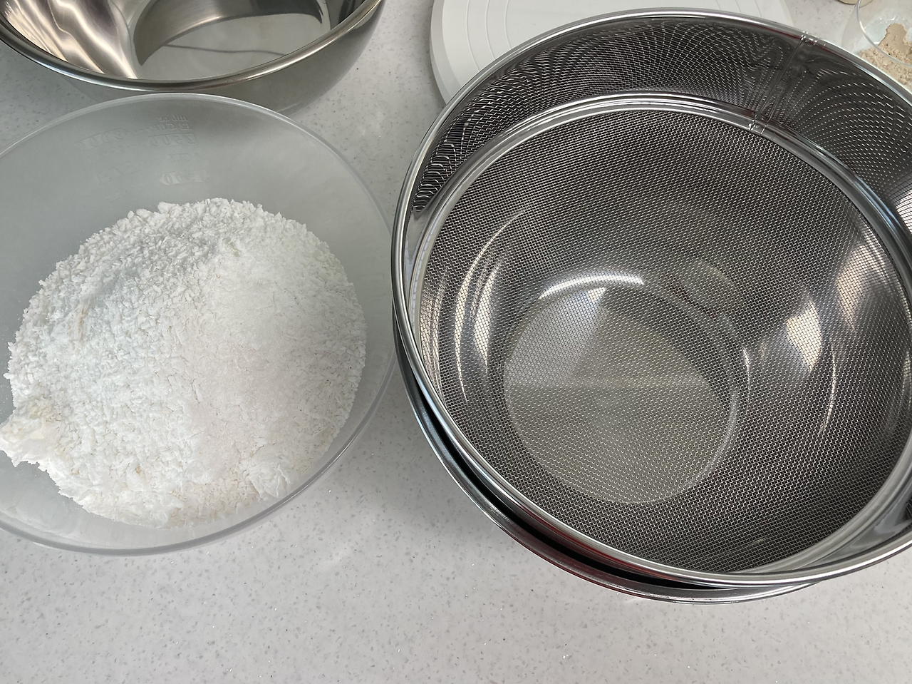 사진상으로 잘 보일지 모르겠지만 찜통 내부 크기보다 사각 무스틀(가로 16.5 x 세로 16.5 x 높이 5cm)이 더 넓어서 바닥에 닿지 않았다. 그래서 무스틀보다는 넣은 체를 찜통 위에 올려놓고 찜통 뚜껑을 닫았는데 뚜껑이 틀에 완전히 닿기도 하고 옆에 뚫려있는 구멍들이 거슬렸다. 일단 문제가 있는 건 알았으니 떡 만들 준비를 시작했다.
