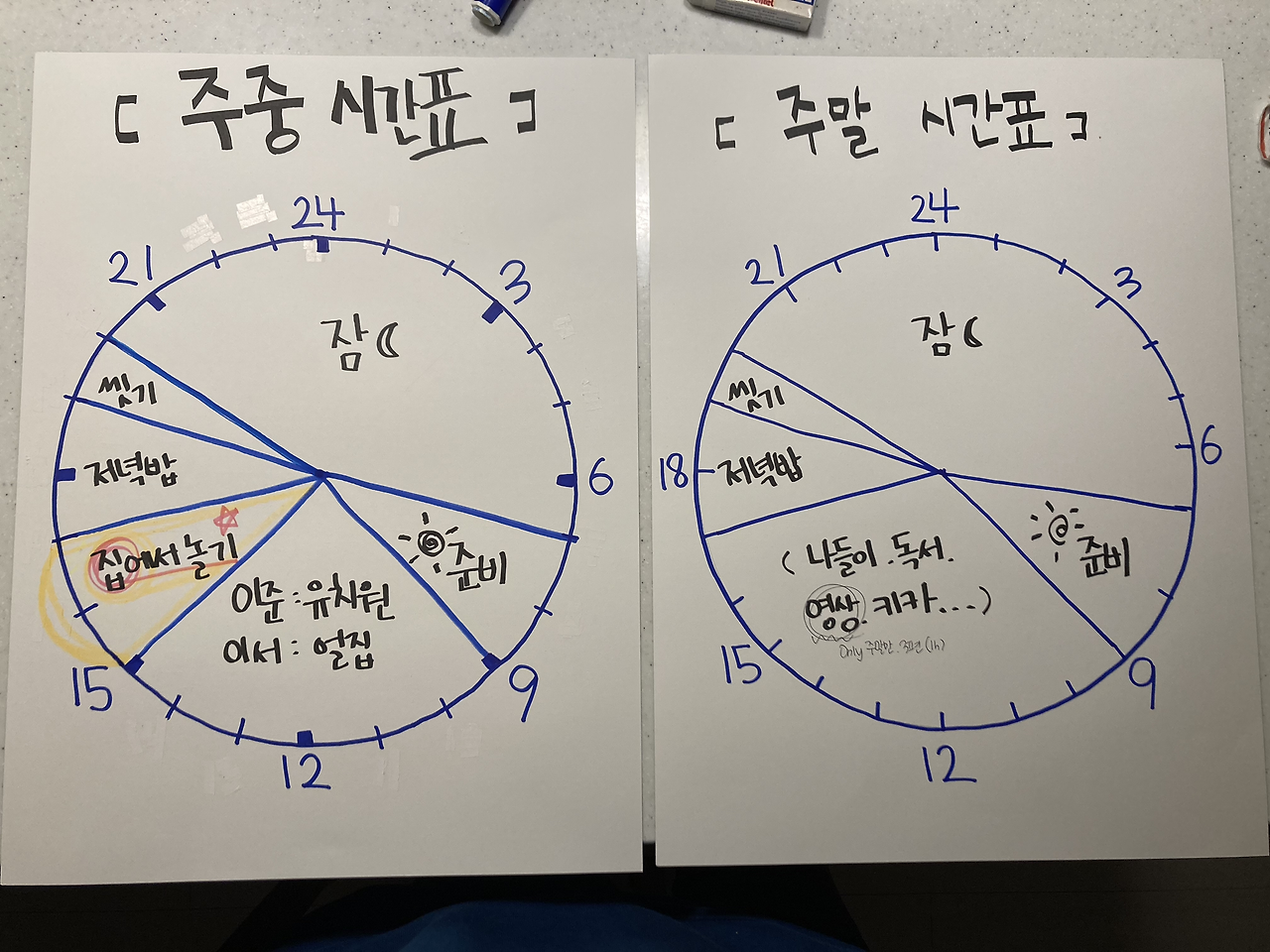 주중&주말 시간표를 잤다. 주중 시간표에서 중요한 점은 아가들 하원 후 집에서 놀기(영상 금지). 집에서 놀면 책을 보든 장난감 놀이를 하든 본인의 놀이에 집중할 수 있는 큰 장점이 있다. 그리고 주말 시간표에 영상 시청을 넣었다. 원한다면 보여주겠지만 되도록이면 안 보기를 바란다.