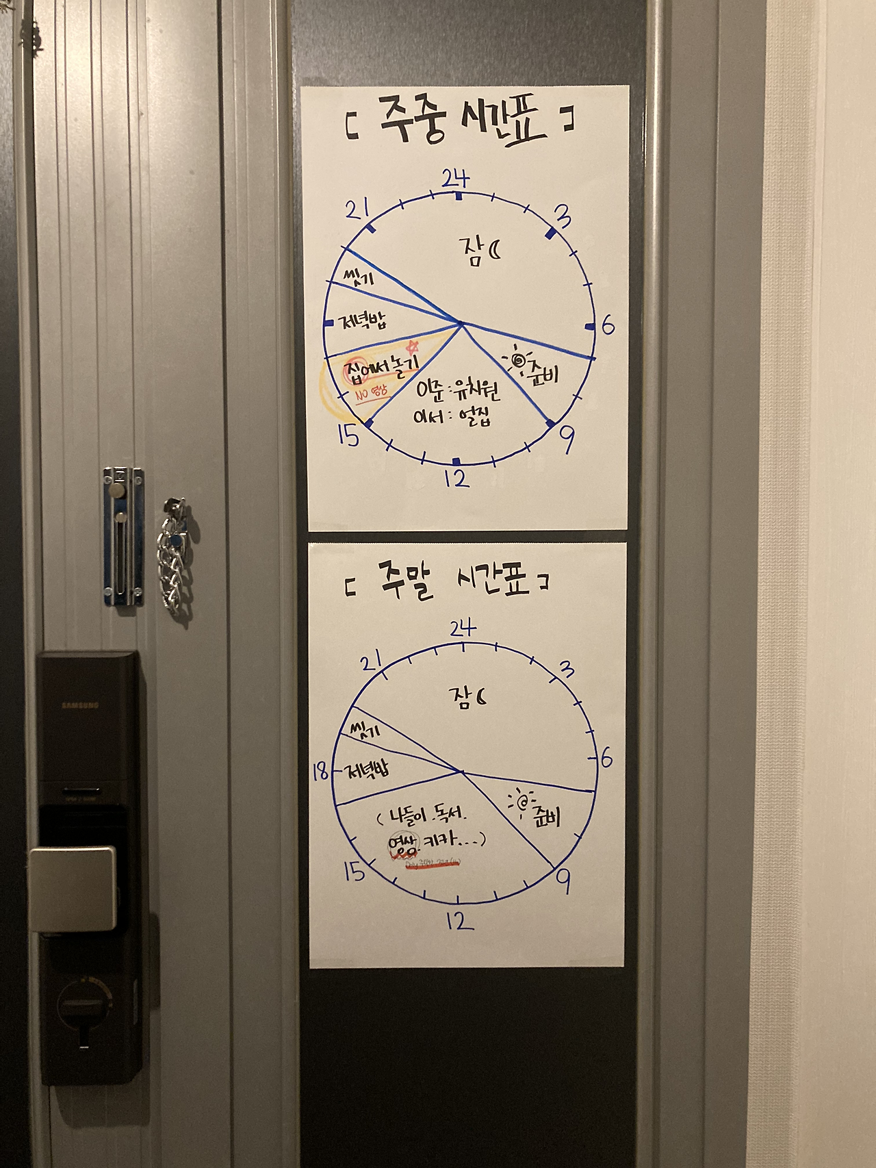 달력 사이즈 종이에 만들었더니 크기가 엄청나다. 안 볼래야 안 볼 수 없다. 현간문에 붙였다. 첫째에게 이 시간표를 왜 만들었으며 지켜야 되는 약속임을 어떻게 설명해 줄지 오늘 밤 고민해봐야 한다. 어쨌든 제일 중요한 엄마의 마음가짐이 잡혔다. 내일부터 실천하면 된다. 영상 노출이 주는 달달함을 맛보기 전으로 돌아가서 잊어버리자. 아직은 강한 자극이 필요 없는 아가들이다. 다시 잘 키워보기로 했다.