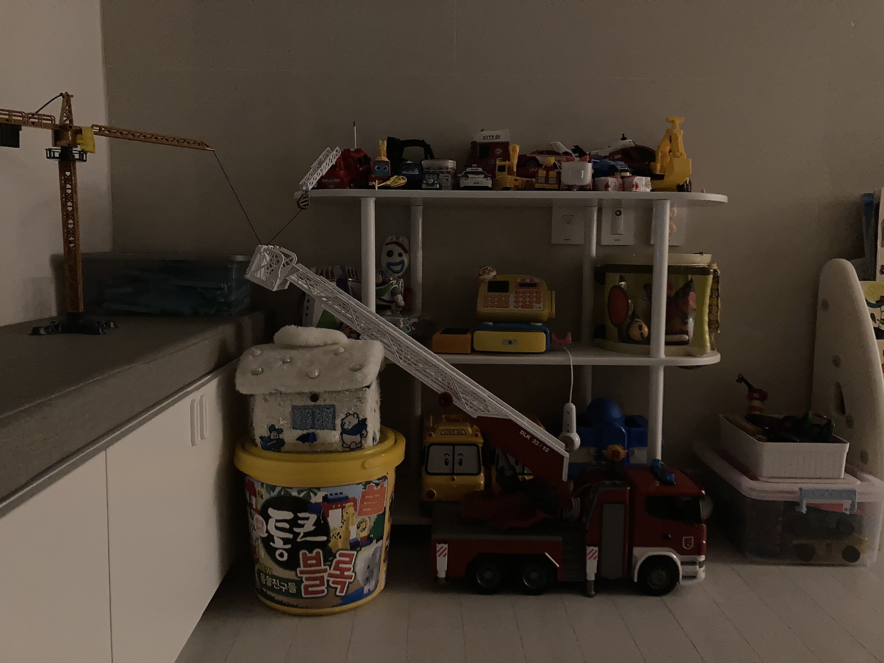 오늘도 하기 싫고 내일도 하기 싫어지니 점점 집안꼴이 엉망이었다. 그래서 그때부터 아가들이 잘 안 가지고 노는 장난감들을 위주로 하나씩 처분하기 시작했다. 물론 사전동의는 없었다. 그래서 당시엔 내 장난감 어디 갔냐고 슬퍼했다. 하지만 더 재미있는 놀이와 이야기가 책 속에 있으니 장난감은 금방 잊었다. 거의 80%를 처분했다. 그랬더니 지금 가지고 있는 장난감은 이게 전부이다.