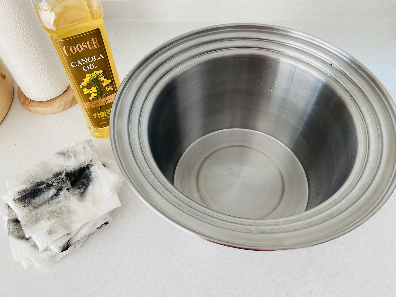 먼저, 심사숙고해서 샀던 인덕션용 스테인리스 물솥의 연마제를 제거한다. 크기가 커서 그런지 아니면 계단 같은 층이 세 개나 있어서 그런지.. 정말 심하게 연마제가 묻어 나왔다. 다른 스테인리스 도구들은 쌀가루가 직접적으로 닿기 때문에 팔이 빠지도록 닦았지만 물솥은 말 그대로 물 끓이는 솥~
