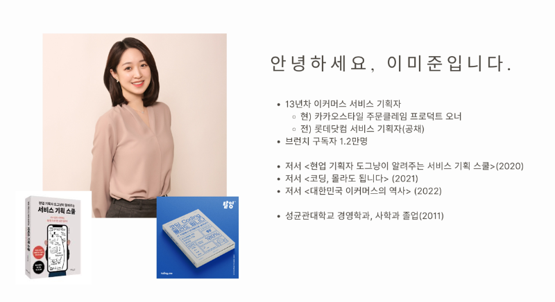 " 안녕하세요, 13년 차 이커머스 서비스 기획자 이미준입니다.