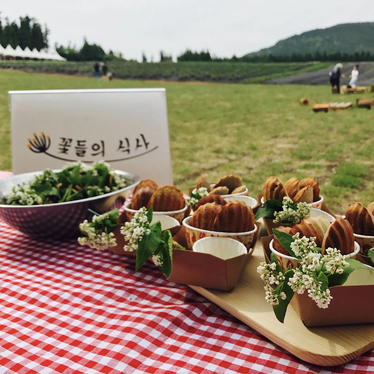 메밀밭 안에 판매 부스를 만들면서 테이블 위를 메밀꽃으로 가득 채웠다. 테이블조차 메밀밭처럼 보였다. 오븐을 메밀꽃이 펼쳐진 곳에 설치해두고 자리를 잡았다. 마들렌은 12분 간격으로 구워져 나왔다. 갓 구워진 메밀 마들렌의 향이 퍼져나가면 사람들이 관심을 가지고 다가왔다. 메밀꽃을 넣은 포장지에 메밀 마들렌을 담아주면 받는 사람이 행복한 미소를 지었다. 하얀 메밀꽃 사이를 산책하면서 음료를 들고 다니기도 좋았다. 구매 고객이 끊이질 않았다. 음식은 향, 맛, 온도가 정말 중요하다는 것을 깨달았다. 역시 대성공!