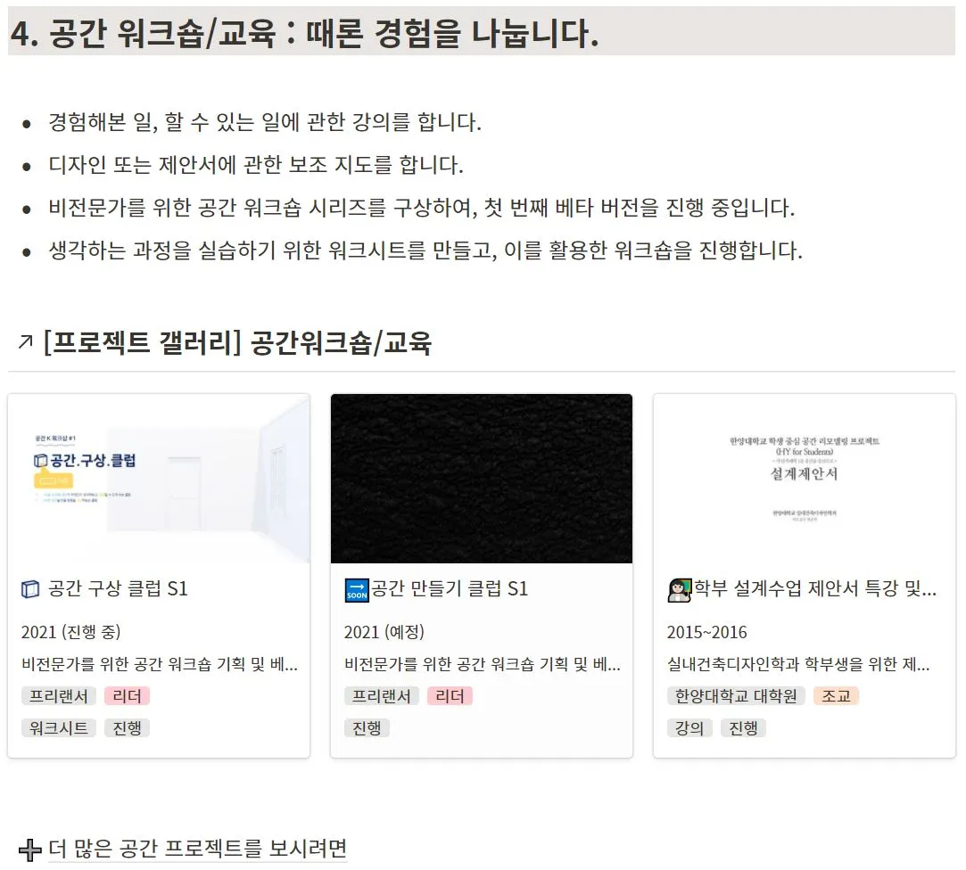 '주요 업무와 프로젝트'들의 설명 마지막 부분에 '더 많은 공간 프로젝트를 보시려면'링크 페이지를 만들어서 메인 페이지에 노출되어 있지 않은 프로젝트까지 포함한 전체 프로젝트를 볼 수 있게 했다. '성장과 확장을 위한 프로젝트'도 마찬가지로 해당하는 전체 프로젝트들을 볼 수 있는 페이지와 연결했다.