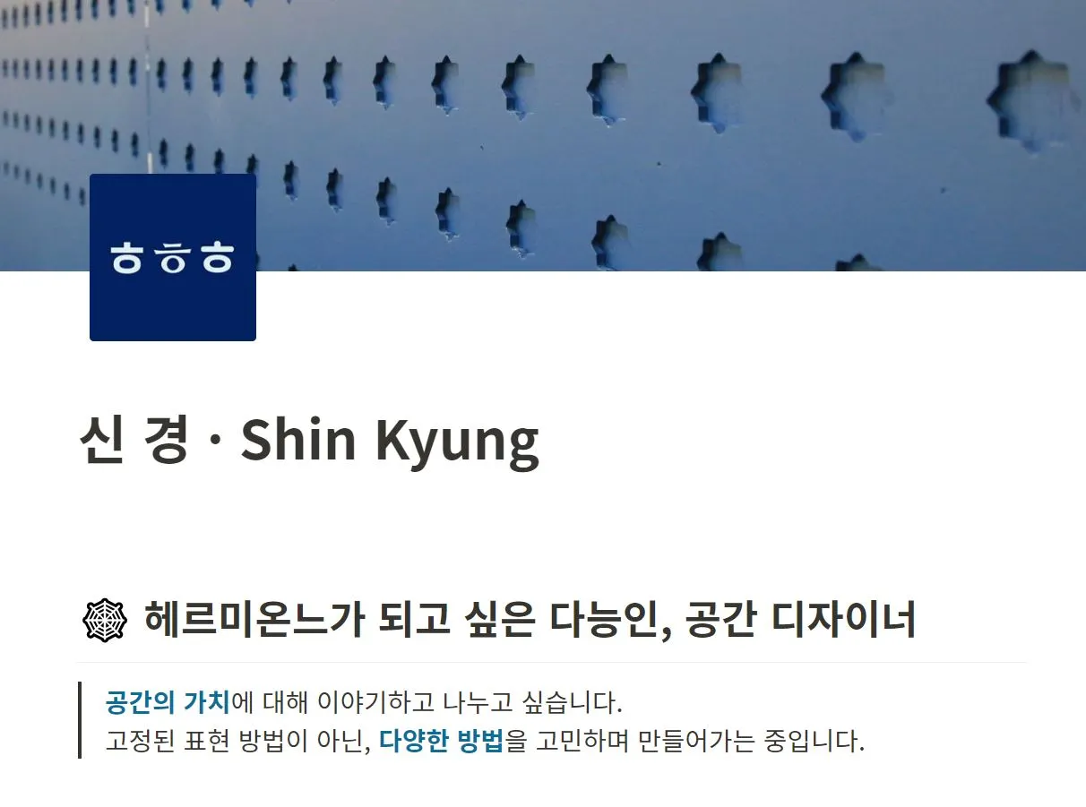 그래서 결과적으로 한 줄 소개는'헤르미온느가 되고 싶은 다능인, 공간 디자이너'로 하고, 나누고 싶은 이야기가 무엇인지, 어떤 방향을 지향하며 무엇을 하고 있는지는 소개를 보충하는 서브 문구로 썼다.
