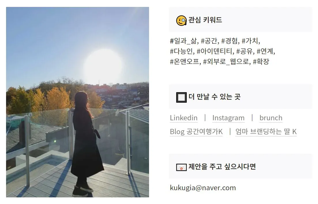 그다음으론 문구에 어울리는 사진을 넣고(사실 포폴엔 앞모습을 넣는 게 나을 것 같다는 생각이 들기도 했지만, 마땅한 사진이 없기도 했고, 문구엔 이 사진이 더 잘 어울릴 것 같아서) 문장에 담지 못한관심 키워드들이 아쉬워, 이런 내용들을 한 꼭지로 달아주었다. 흩어져있는 기록들을 '더 만날 수 있는 곳'으로 링크를 걸어줬고, '제안을 주고 싶으시다면'으로 메일 주소를 남겼다.