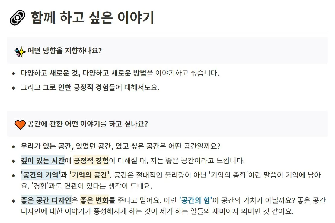 그 이후에는 일방향적인 이야기를 하기보다 같이 이야기를 만들어가고 나누고 싶다는 생각이 들어서, '다양한 방식으로 공간의 가치를 (또는 의미를) 나누는 사람'이라고 수정했다. 이 부분까지는 '벼락치기 포폴 만들기'를 시작하기 이전에 써놓았던 부분이다.