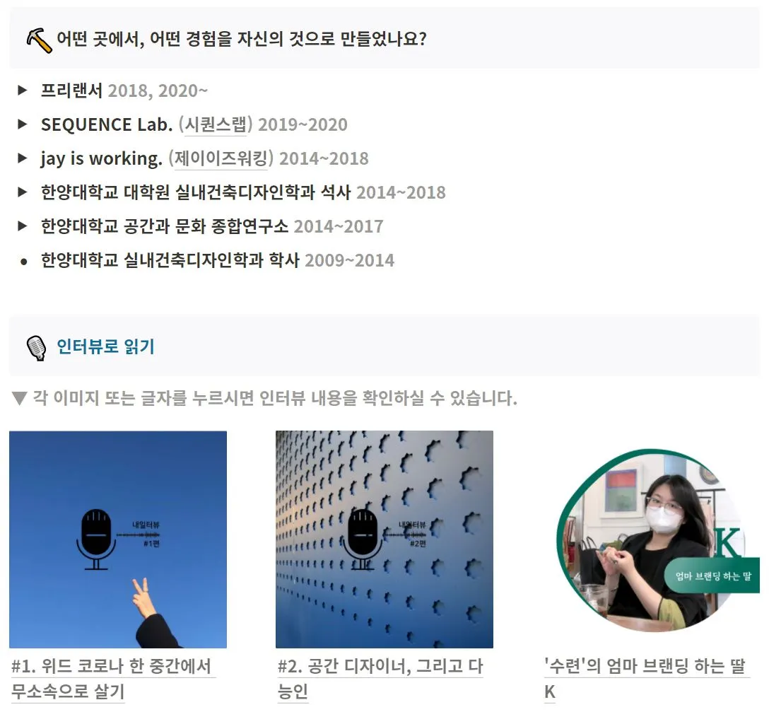 그다음엔어디에서 어떤 경험으로 무엇을 배웠는지를 아래에 추가했다. 그리고 핵심적인 스토리나 에피소드는 인터뷰 방식으로 써둔 것들이 있어 링크를 걸었다. 지난주에 인터뷰이로 참여한 인터뷰도 발행되면 여기에 넣고, 이후에 많아지면 갤러리 뷰 타입으로 바꿔야겠다고 생각하면서.