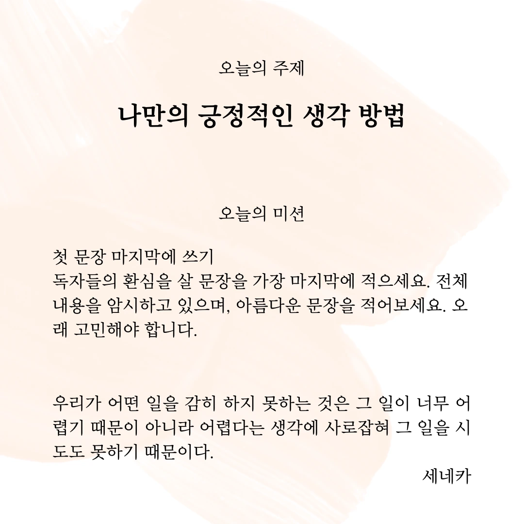 인생의 오랜 선배들은 그걸 알았고 사람들에게 전하고 싶어 했다. 인생만사 새옹지마, 일장일단, 동전의 양면, 양날의 검. 모두 비슷한 이야기를 해 주고 싶었던 옛 어른들이 남긴 말들 아닐까. 지나고 보면 모두가 알게 되지만 막상 눈앞에 상황에 닥치면 앞이 캄캄해진다. 머릿속은 암전 되고 진흙 구덩이에 이미 2/3 정도는 빠져 옴짝달싹할 수 없는 것처럼 느껴진다. 세상에서 가장 질기고 가느다란 줄들이 여기저기 엉켜 온몸을 묶어놓은 것처럼 무기력해진다. 눈물이 앞을 가리고 어떤 천재도 해결책을 내놓기 어려워 보이는 현실에 절망하게 된다. 그럴 때는 아무것도 하지 않고 멈추는 것이 필요하다. 뚫어져라 볼수록 틀린 그림은 안 보이기 마련이다.꽁꽁 언 얼음처럼 생각도 행동도 모두 멈춰보자. 내가 하는 방법은 드라마나 영화를 보거나 잠을 자는 것이다. 잠깐 멈췄다가 다시 현장에 서면 안 보이던 것들이 눈에 들어오기 시작한다. 아무리 눈 씻고 찾아보아도 나타나지 않던 긍정의 씨앗이 고새 자라 싹을 틔워놓았다. 긍정적인 생각을 하지 않아도 된다. 당신을 애타게 기다리고 있을 긍정적인 생각을 찾으면 된다.
