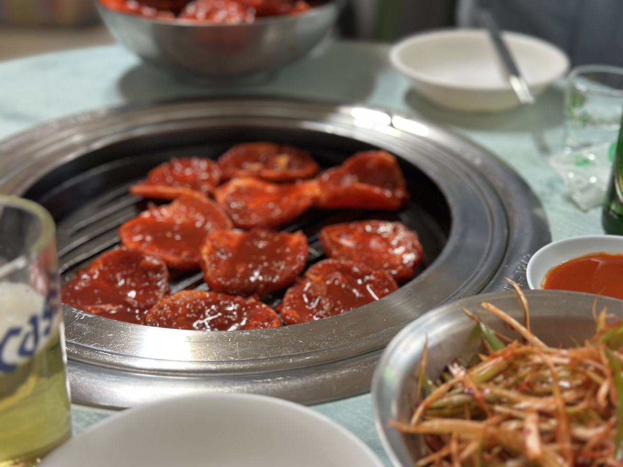 메뉴가 엄청 단출하다. 돼지 등심 양념구이. 드디어 빨강 고기의 정체를 알았다. 국내산 돼지 등심 양념구이였구나. 고기가 나오자마자 빨강 고기라는 별명도 단번에 이해됐다. 정말 말 그대로 빨갰다. 모든 양념 고기가 그렇겠지만 열심히 뒤집어주어야 타지 않는다. 흔한 된장찌개, 김치찌개도 없어서 오롯이 단백질을 충실하게 섭취하게 되는 훌륭한 다이어트식이다. 파절이 말고는 별다른 밑반찬도 없다. 물론 파절이가 꽤 맛있다. 아삭한 식감에 새콤달콤한 양념이 약간 퍽퍽하고 매운 고기와 잘 어울린다. 그토록 궁금했던 빨강 고기인데 막상 먹어보니 엄청난 맛은 아니다. 강렬하고 자극적이지 않으니 오히려 더 자주 많이 먹을 수 있나 싶다.