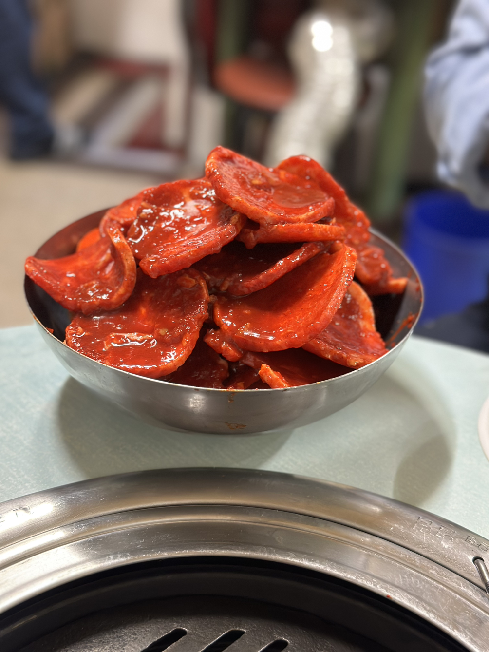 남편이 회식 메뉴를 정할 수 있다면, 항상 빨강 고기다. 10번 중의 9번은 빨강 고기다. 빨강 고기가 대체 뭐길래. 빨강 고기를 먹고 온 날에는 옷에 냄새가 굉장하다. 의류관리기에 옷을 돌려도 냄새가 어딘가 남아있는 듯해서 결국 세탁을 하게 된다. 맨날 바쁜 남편이라 남편친구들이 회사 근처로 모이는데 그럴 때마다 빨강 고기를 먹는다. 오랜 친구들이라 편해서인지 만취하는 경우가 많아서 먹어본 적 없는 고기에게도 날 선 감정을 느낀다. 솔직히 털어놓자면 궁금한 것도 크다. 대체 무슨 맛이길래 매번 먹는지, 안 질리는지 궁금해 죽겠다. 드디어 빨강 고기를 먹어볼 일이 생겼다. 푸근하고 친절한 사장님이 반겨주셨다. 자리가 많지 않다. 일층에 3-4자리가 있고 절벽같은 계단을 올라 2층에 가면 3-4자리가 있다.