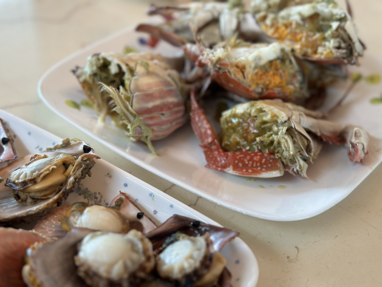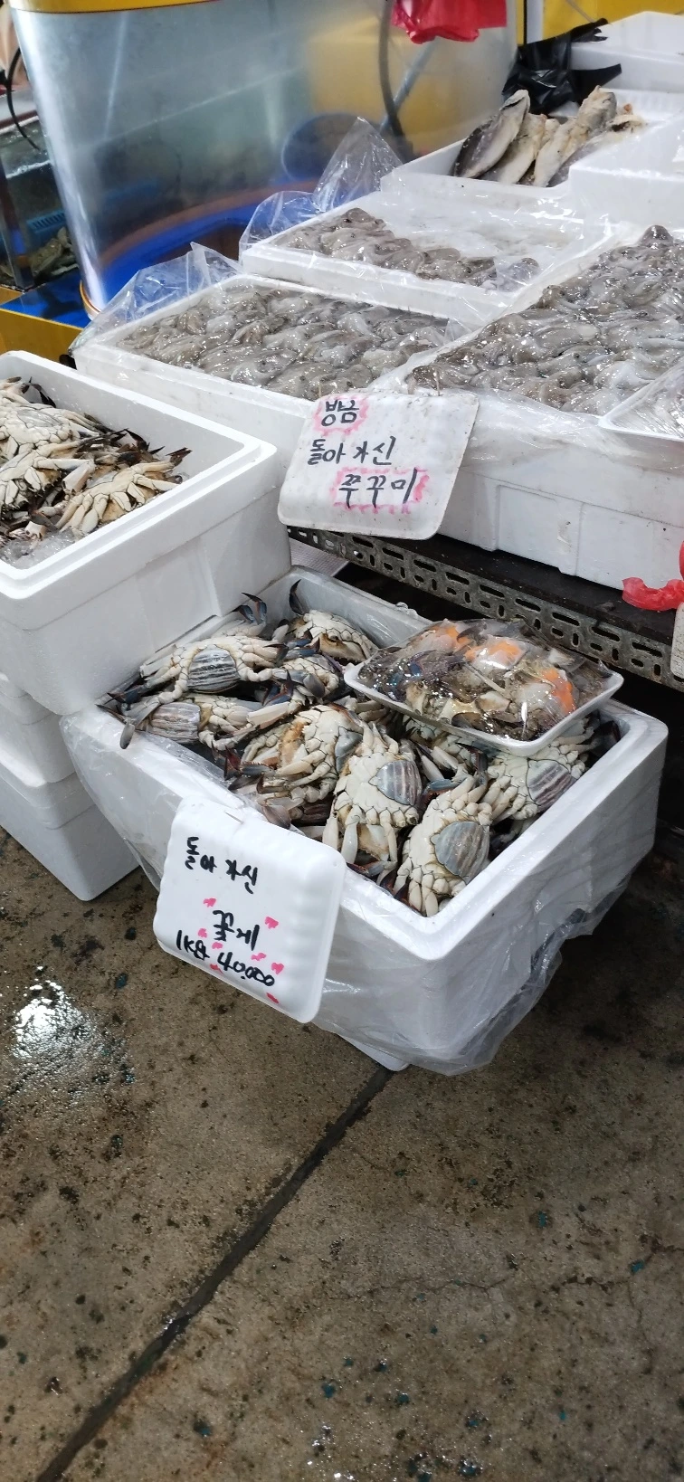 막 돌아가신 꽃게와 주꾸미를 지나 싱싱해 보이는 살아있는 꽃게가 보인다. 인상 좋은 주인아주머니가 인원에 맞춰 2.5킬로 정도를 권해주신다. 가리비를 몇 개 더 주시겠다는 아주머니 말에 아빠가 엉뚱한 답을 하신다.