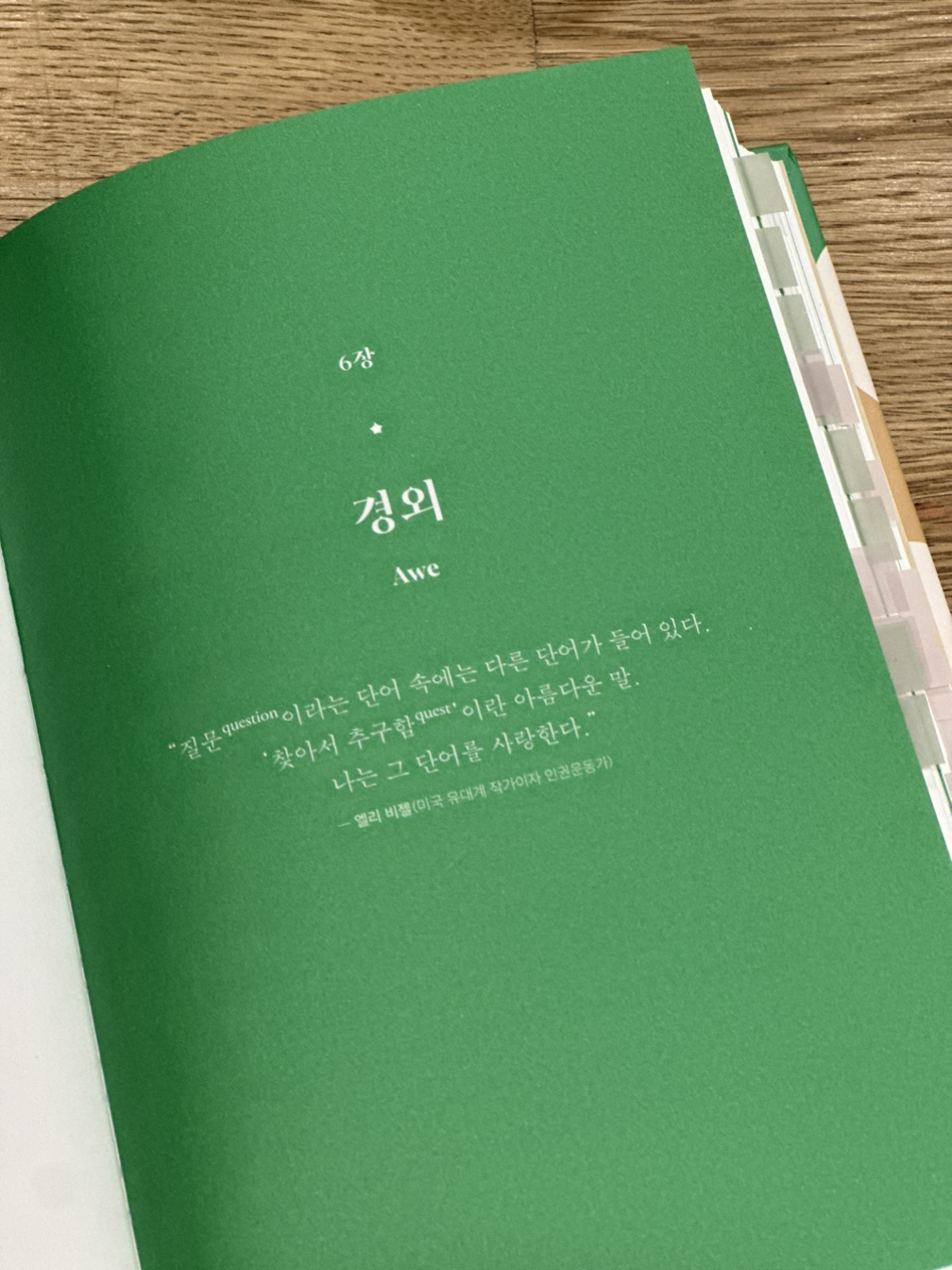 제가 감사 챕터보다 더 많은 인덱스를 붙인 곳은 '경외 '편이에요. 작가님은 '경외'라는 단어를 들으면 어떤 느낌이 드세요? 저는 경외라는 단어는 종교적인 것으로 생각했어요. 일상에서 경외를 느낀 순간도 종교적이었죠. 종교적인 공간에 간다든지, 종교적인 체험을 한다든지 하는 때요. 특별하고 강렬할 수 있지만 드물고 짧은 순간들뿐이라 일상과는 거리가 멀다고 생각했어요. 작가는 '기적을 보겠다고 마음을 열기만 한다면, 때때로 가 아니라 매일 기적이 일어난다'라고 믿는대요. 작가는 기적을 '반짝거리는 눈으로 세상을 보는 것'이라고 말해요. 감사처럼 기적 역시 나의 시선 끝에서 피어나는 꽃이라고 느껴졌어요. 행운이라고 느꼈던 일들, 우연히 잘 들어맞았던 것들이 모두 기적이었던 것이죠. 기적에서 느끼는 것이 경외라면, 감사 다음 단계구나 싶었어요. 최근에 삶에 대한 여러 책을 읽게 되었는데 공통적으로 '영성'에 대한 이야기가 나오더라고요. 전 '영성' 역시 경외처럼 종교적이라고 치부했어요. 어쩌면 경외보다도 더 종교와 직접적으로 연결되어 있다고 생각했어요. 저는 종교가 있지만 열심히 다니지 않아서 그런지 '영성'이라는 단어는 상당히 거리감이 느껴졌어요. 그러니 당연히 내 일상과 연결되어 있다고 느끼지 않았지요. 그런데 작가가 말하는 '영성'은 가까운 곳에서도 찾을 수 있더라고요.