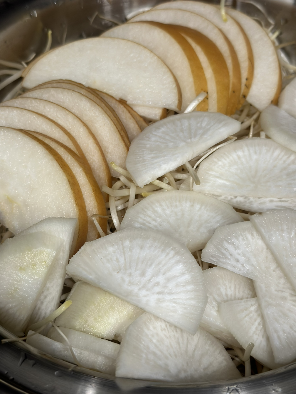 최근에 기침이 잘 떨어지지 않는다는 주변 사람들의 이야기가 많이 들린다. 코로나 이후로 사람들의 기관지가 약해진 것일까 혹은 변형된 바이러스에 기존 약들이 잘 듣지 않는 것일까 혼자 이런저런 생각하며 추측한다. 배즙을 따라주고는 기침이라고 키워드를 넣어 검색한다. 눈에 띄는 새로운 정보가 있다. 콩나물 식혜가 오래된 기침에 특효약이란다. 콩나물 식혜? 처음 들어보는데 이름이 참 흥미롭다. 뭘까? 실은 가자미식해처럼 콩나물식해일까? 아니면 식혜에 콩나물을 넣는 것일까? 어느 쪽도 쉽게 그려지지 않는다. 인터넷에 소개된 요리법은 간단하다. 콩나물의 머리를 따고(함께 넣어도 무방하지만 비린내가 심하다고 한다) 무와 배를 썰어 넣고 갱엿을 넣어 한참 동안 뭉근하게 졸인다. 조리법은 아주 간단하지만, 갱엿이 없어서 아쉽게도 당장 만들 수가 없다. 아이 덕분에 갱엿을 사본다. 하루 만에 온 갱엿은 어릴 적 시장에서 봤던 것이다. 두툼한 나무 쟁반같이 생겨서 비닐에 쌓여있던 것이 갱엿이구나. 약한 불에 3시간 정도 달이면 된다고 하니 이제 기다리기만 하면 된다.