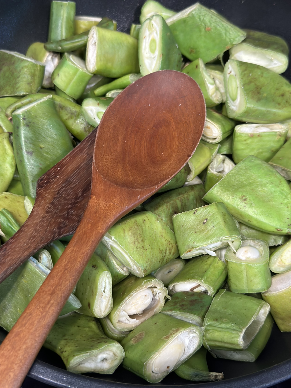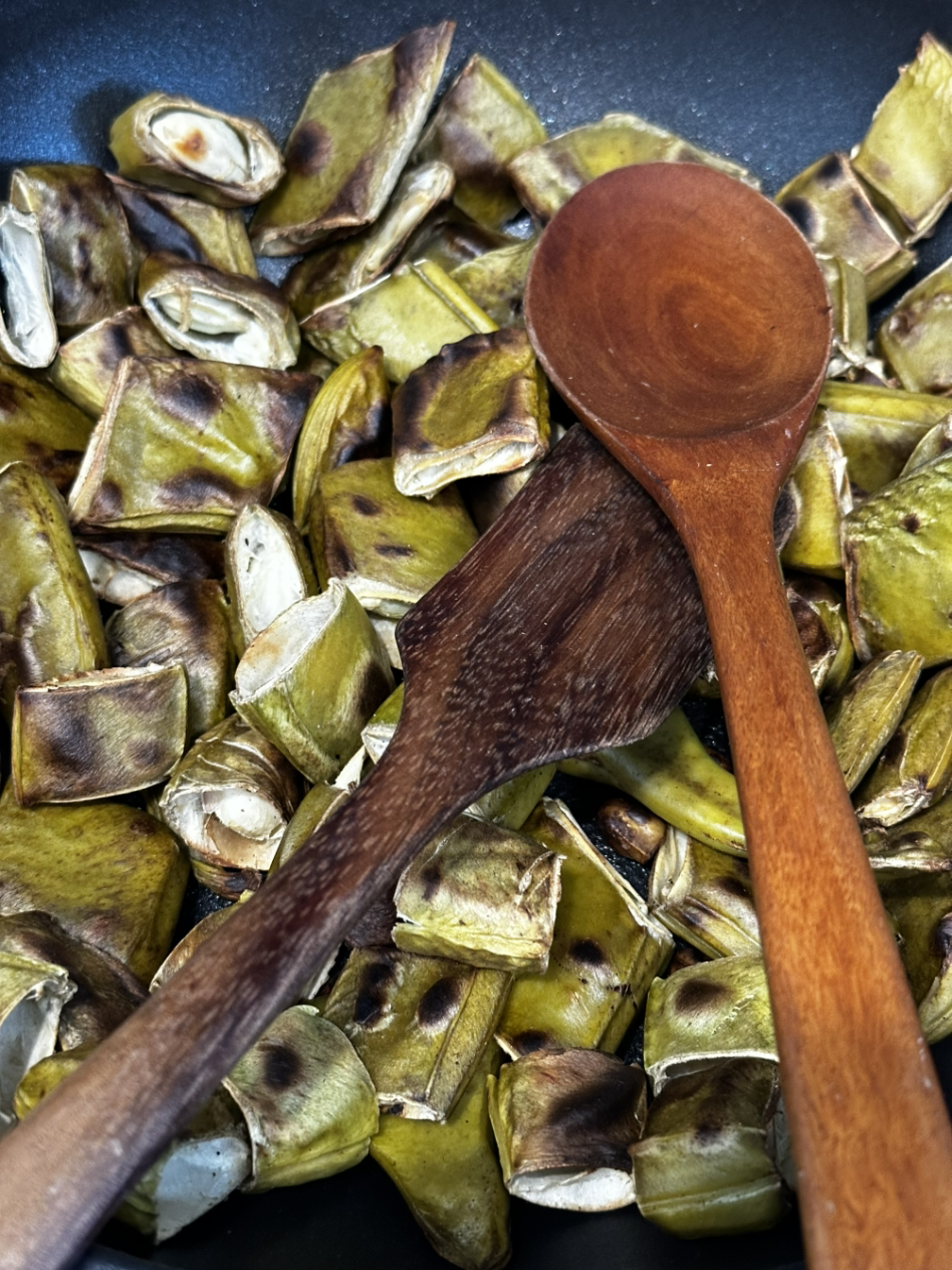 시댁에 가니 어머님이 팔뚝만 한 작두콩을 꺼내시며 뭔지 아냐고 물으셨다. 다름 아닌 작두콩이었다. 작두를 꼭 닮은 모습에, 처음 봤지만 바로 알 수 있었다. 덖으면 작두콩 차가 된다며, 직접 해도 되고 하기 어려울 것 같으면 커피 볶는 집에 맡기라고 하셨다. 아무리 생각해도 이 거대한 콩을 들고 갈 자신이 없던 나는 직접 해보기로 했다. 작두콩을 꺼냈는데 이걸 볶는다고 내가 아는 티백에 담긴 작두콩 차로 바뀐다는 사실이 믿기지 않았다. 깨끗하게 씻은 작두콩을 썰어보려 했지만, 만만치 않았다. 엄청나게 두꺼운 껍질에 그 안에 있는 씨앗은 어찌나 단단한지 온 힘을 다해야 잘렸다. 혹시 작두로 잘라야 해서 작두콩인 걸까 잠시 생각했다. 잘 갈린 칼로도, 만능 가위로도 쉽게 해결되지 않아 결국 남편을 불러 겨우 잘랐다.